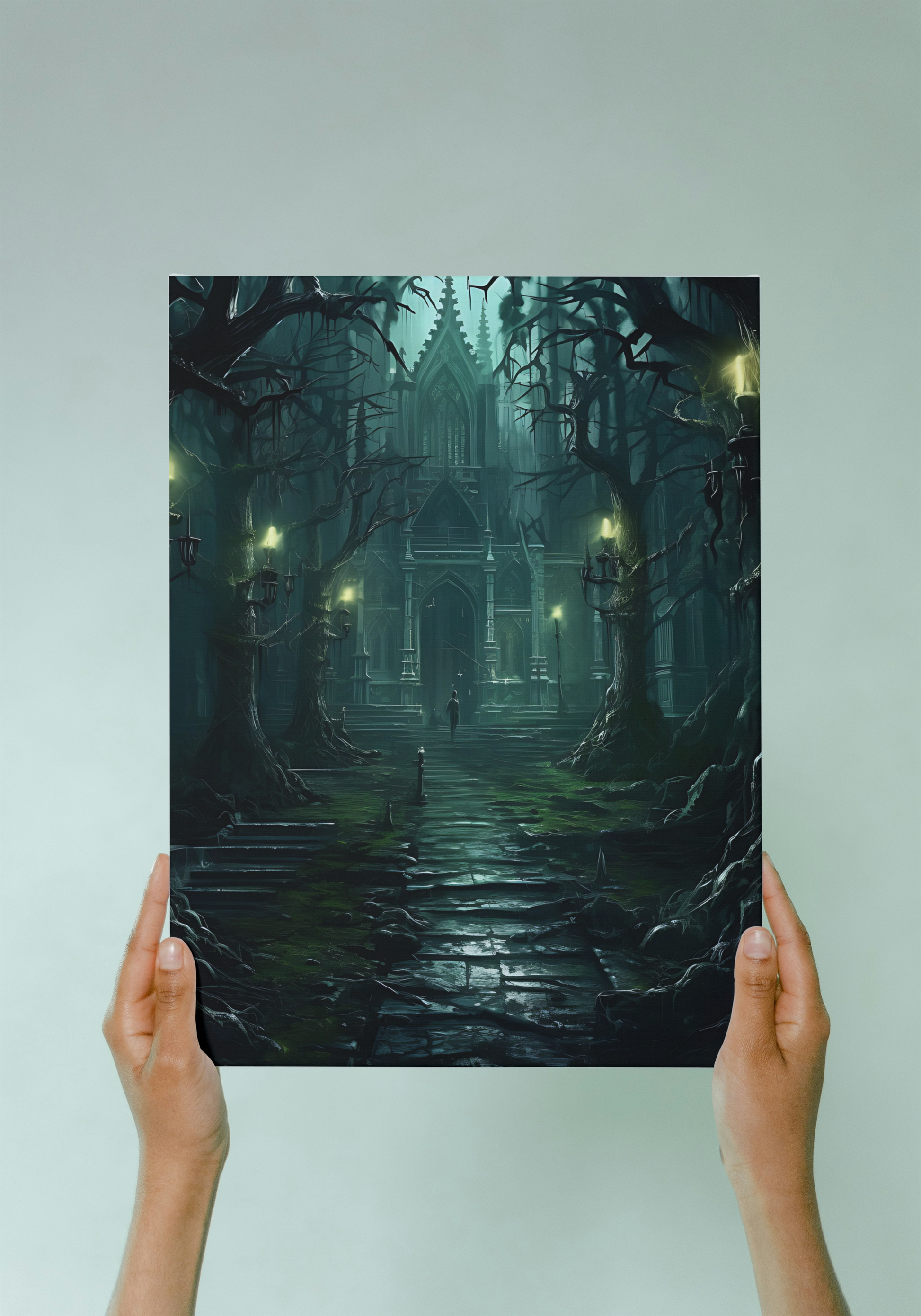 Immerse yourself in the haunting allure of gothic storytelling with this framed matte canvas print—an atmospheric piece that draws you straight into the heart of a dark fairytale. A winding, cracked pathway leads your eye through a shadow-drenched forest, lit only by a pair of eerie Victorian-style lampposts. At the end of the path looms a crumbling gothic castle, seemingly abandoned but pulsing with mystery. It’s a beautifully eerie scene that evokes a sense of both wonder and foreboding—perfect for those who live for the macabre, the mysterious, and the magical.