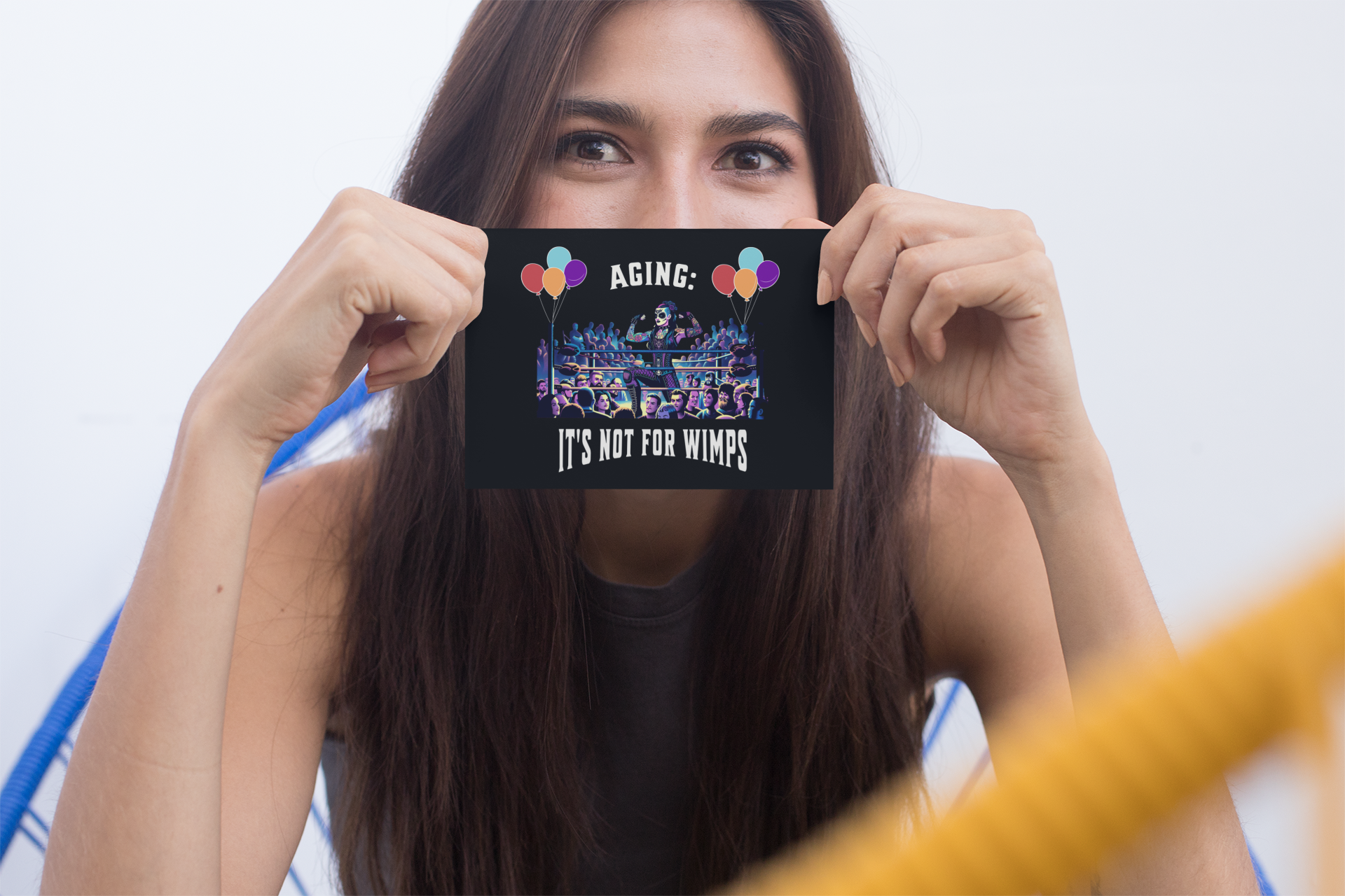 Celebrate strength, sass, and gothic glory with this fiercely empowering birthday card, featuring a tattooed gothic wrestler center stage in a vintage ring. With “Aging: It’s not for wimps!” boldly declared above quirky gothic balloons, this design is all about honoring confidence, resilience, and unapologetic individuality.