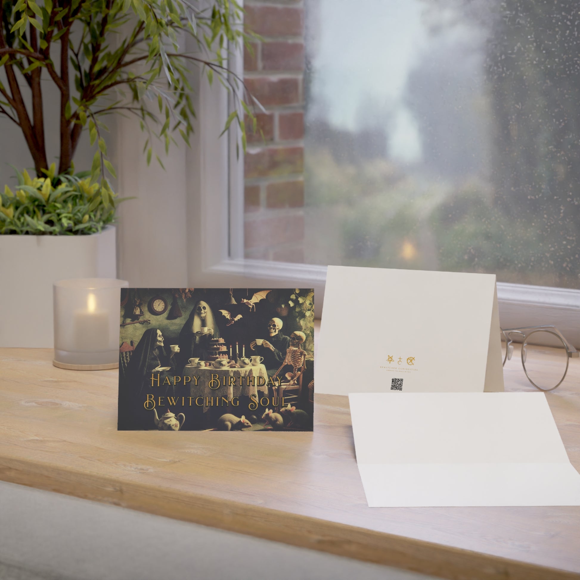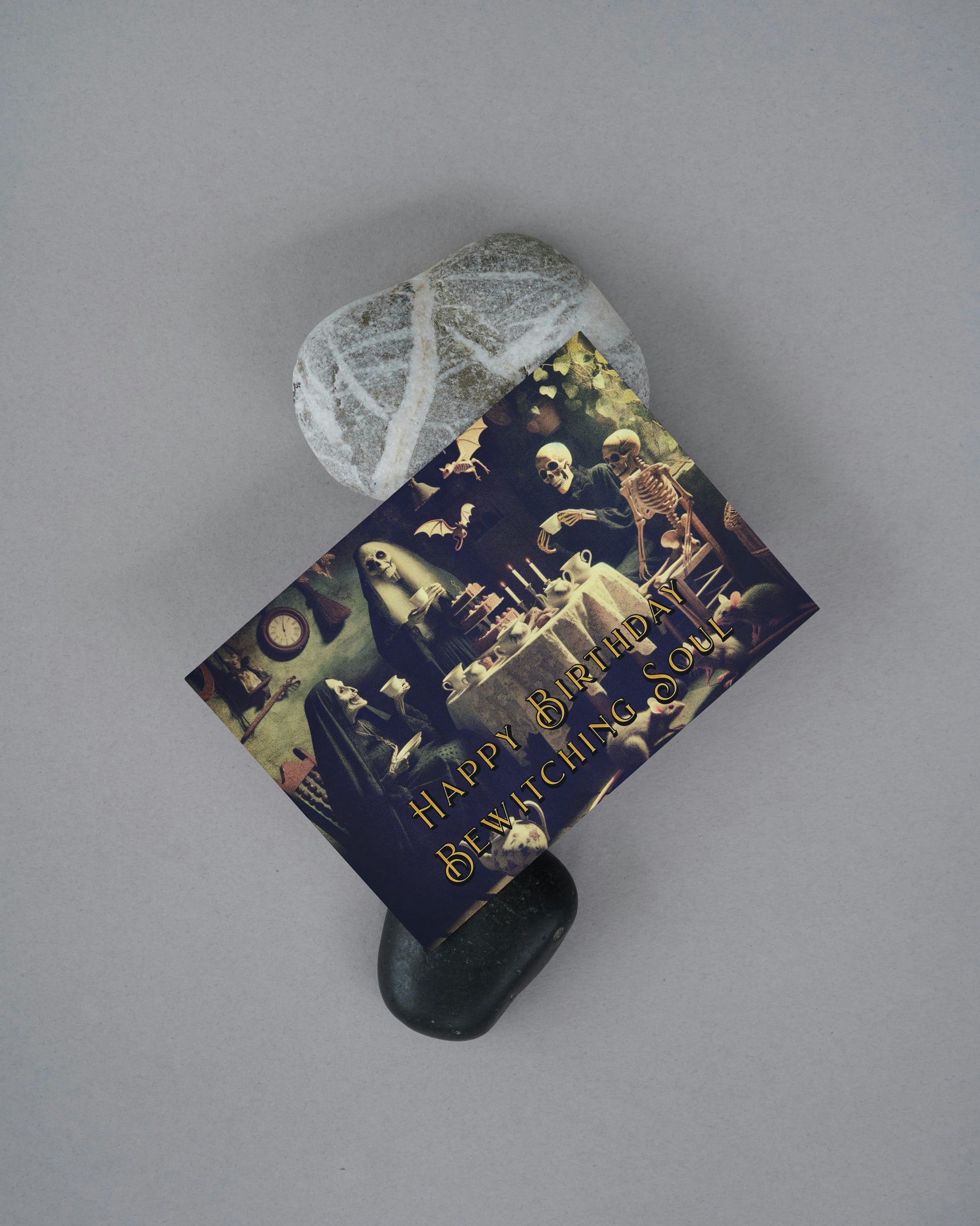 Celebrate with spooky charm and playful magic! This gothic birthday card features a skeleton tea party inside a cozy witch’s cottage—complete with teapots, birthday cake, candlelight, and fluttering bats.