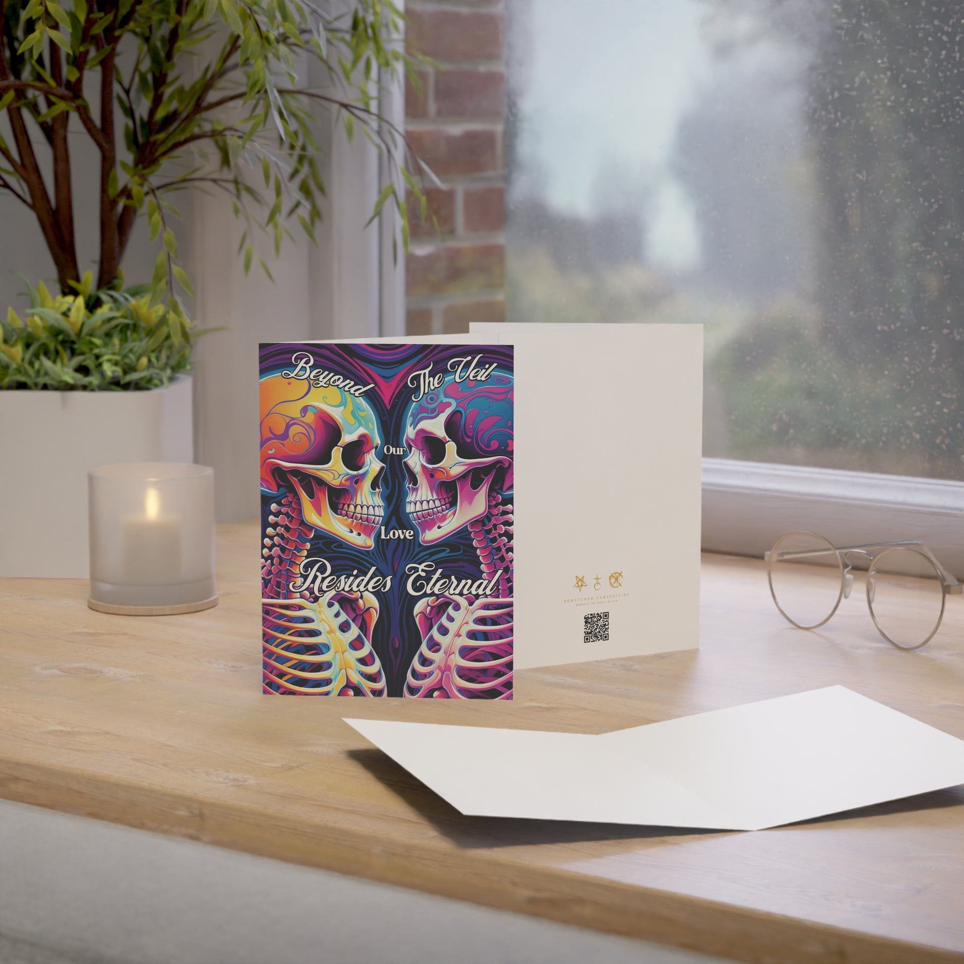 Celebrate a love that transcends time with gothic romance and cosmic flair. This striking card features two skeletons face-to-face, captured in a moment of eternal connection beneath the words “Beyond The Veil, Our Love Resides Eternal.”