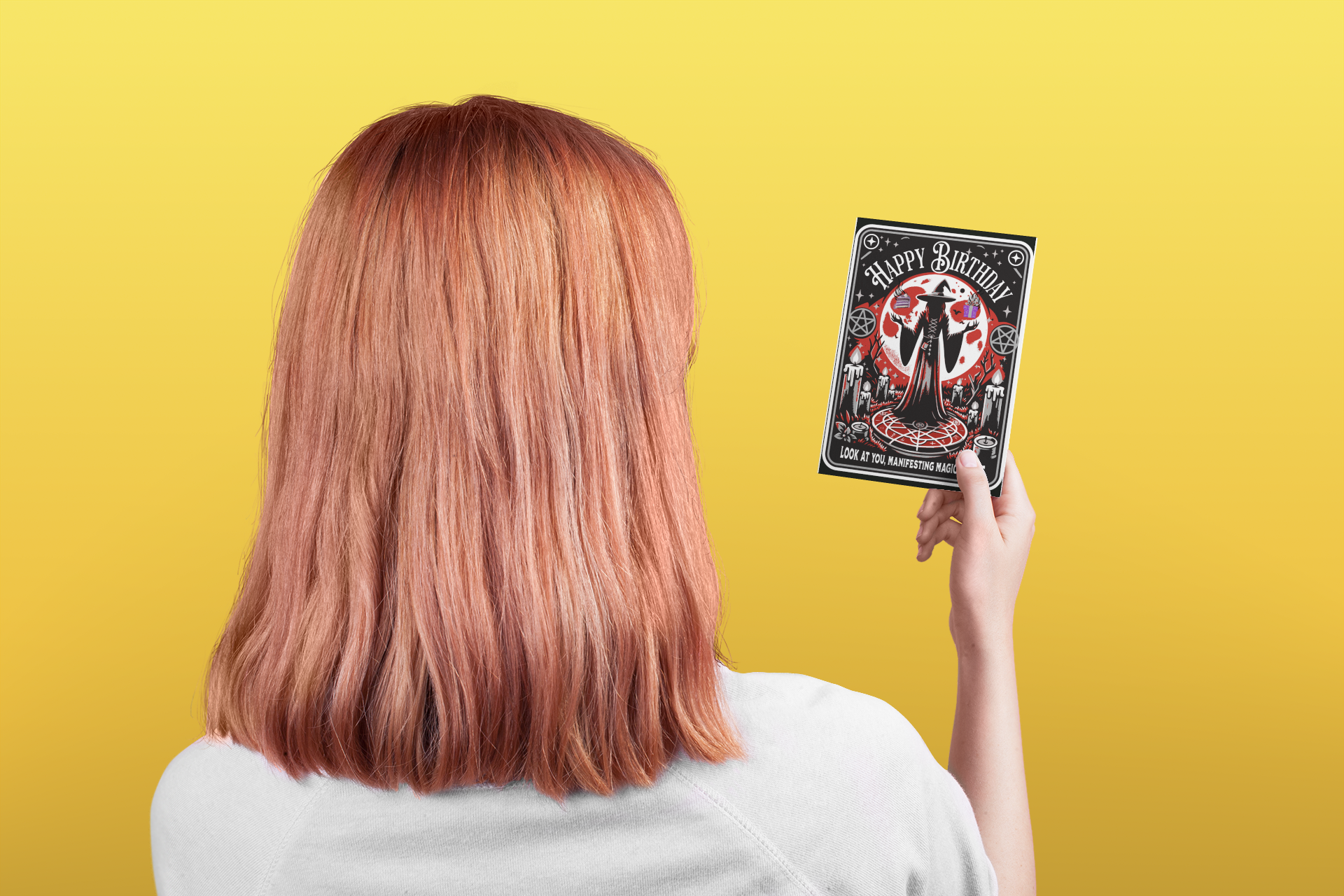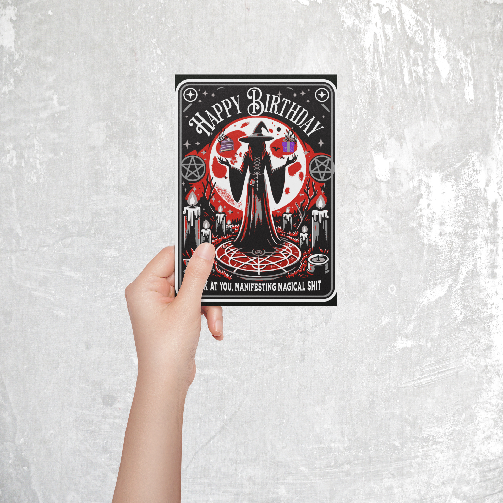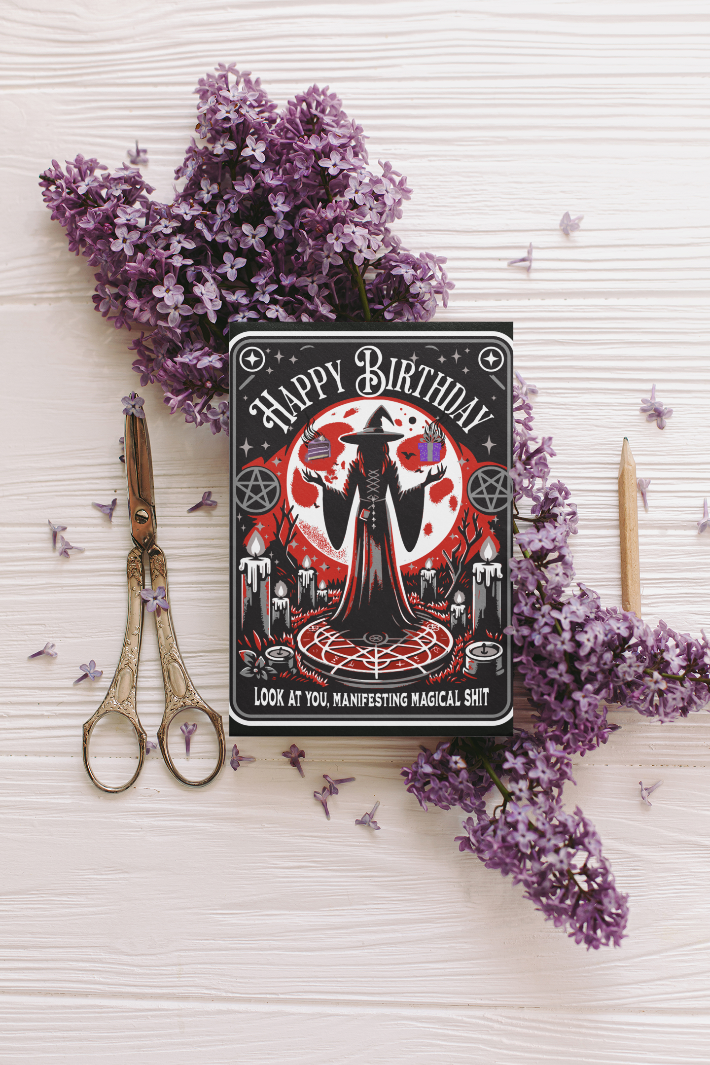 Send birthday magic with witchy mischief and gothic flair! This enchanting card features a charismatic witch mid-spell, conjuring presents, cake, candles, and swirling energy, surrounded by pastel florals, twisting trees, and Wiccan symbols.