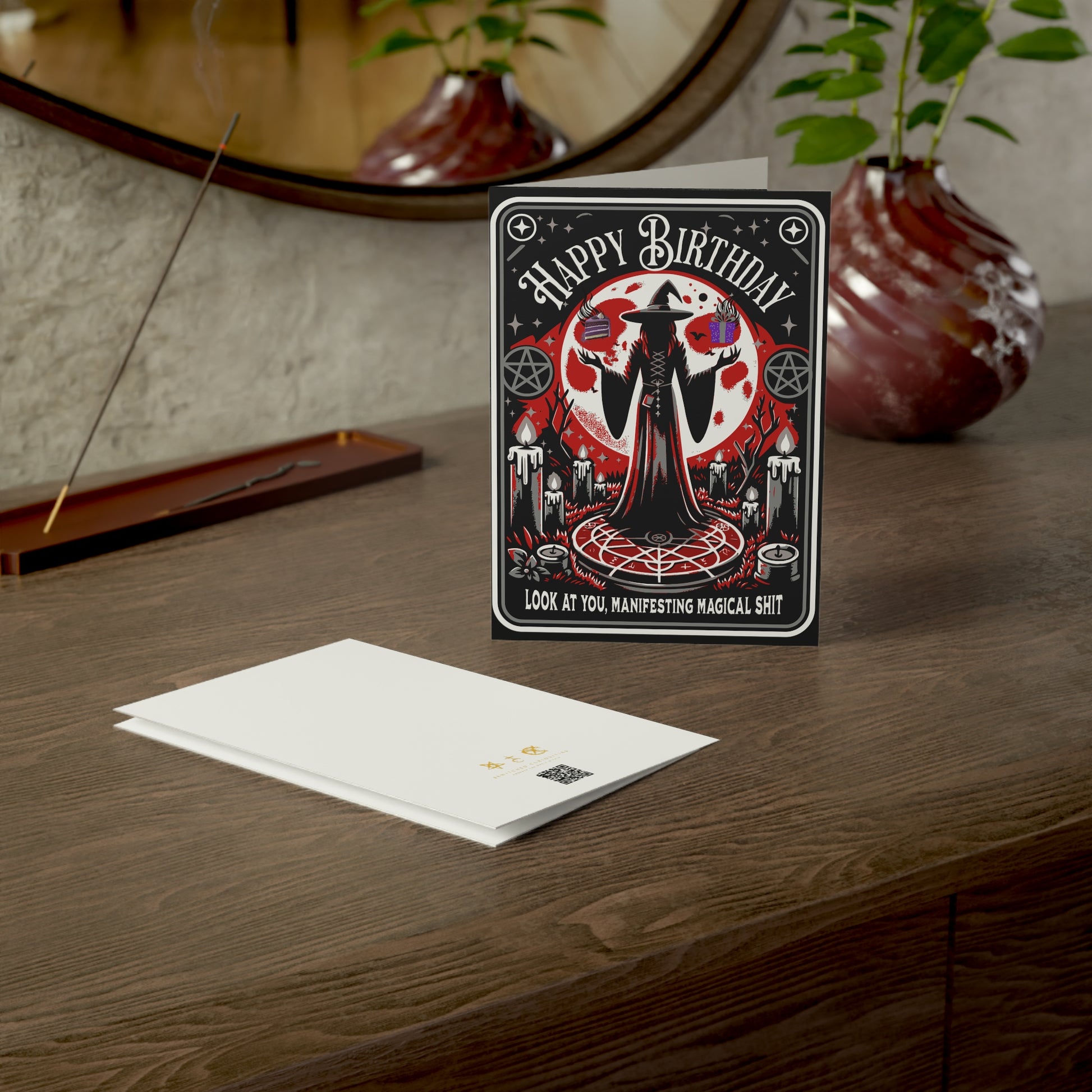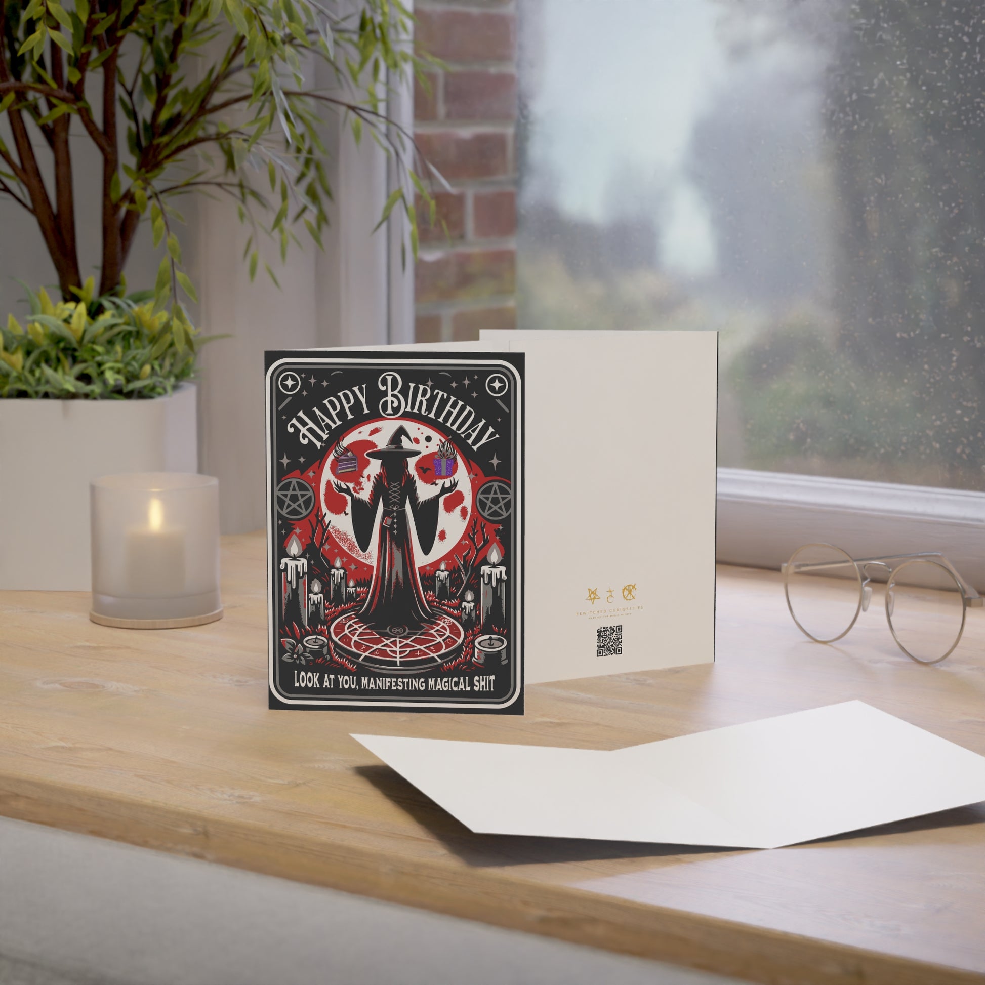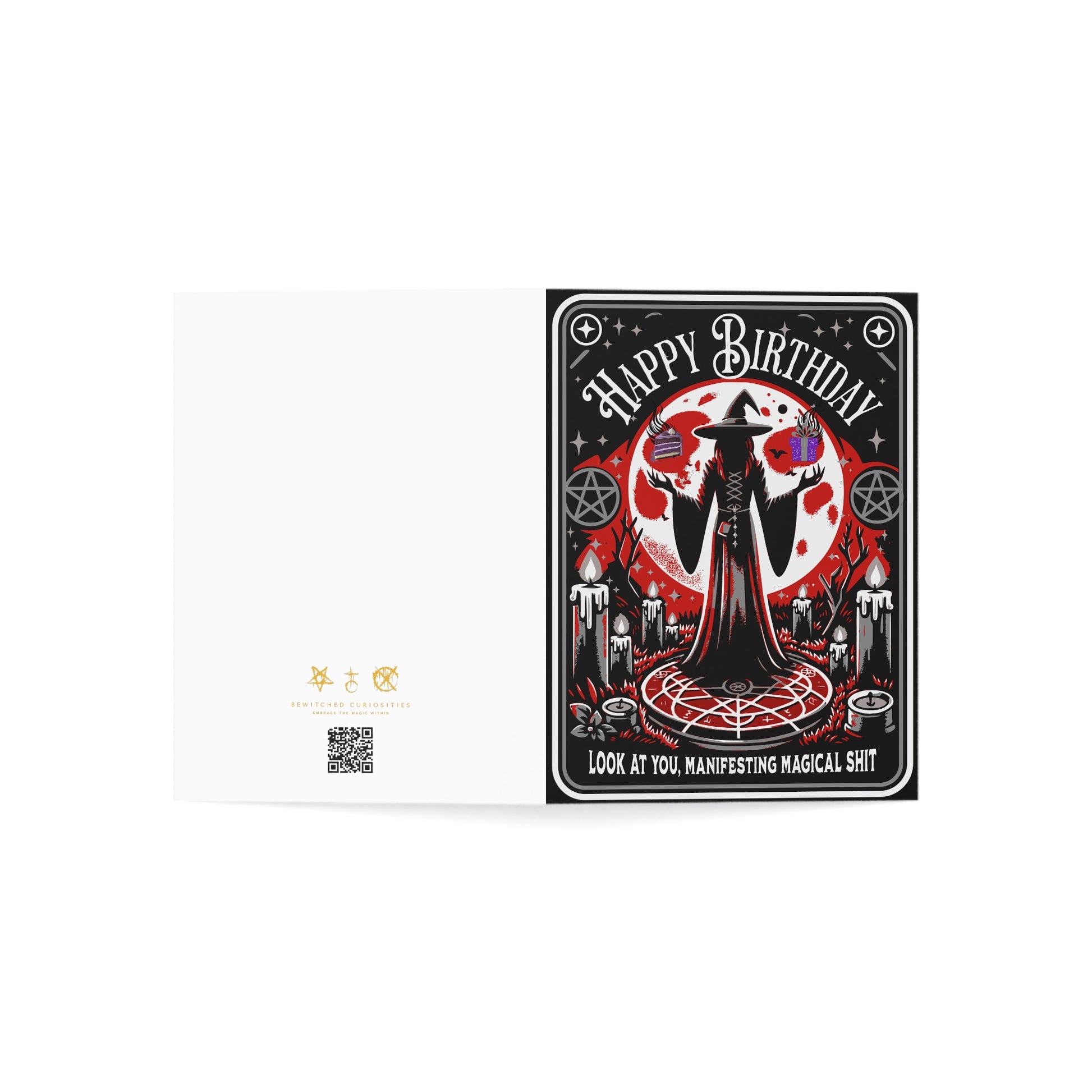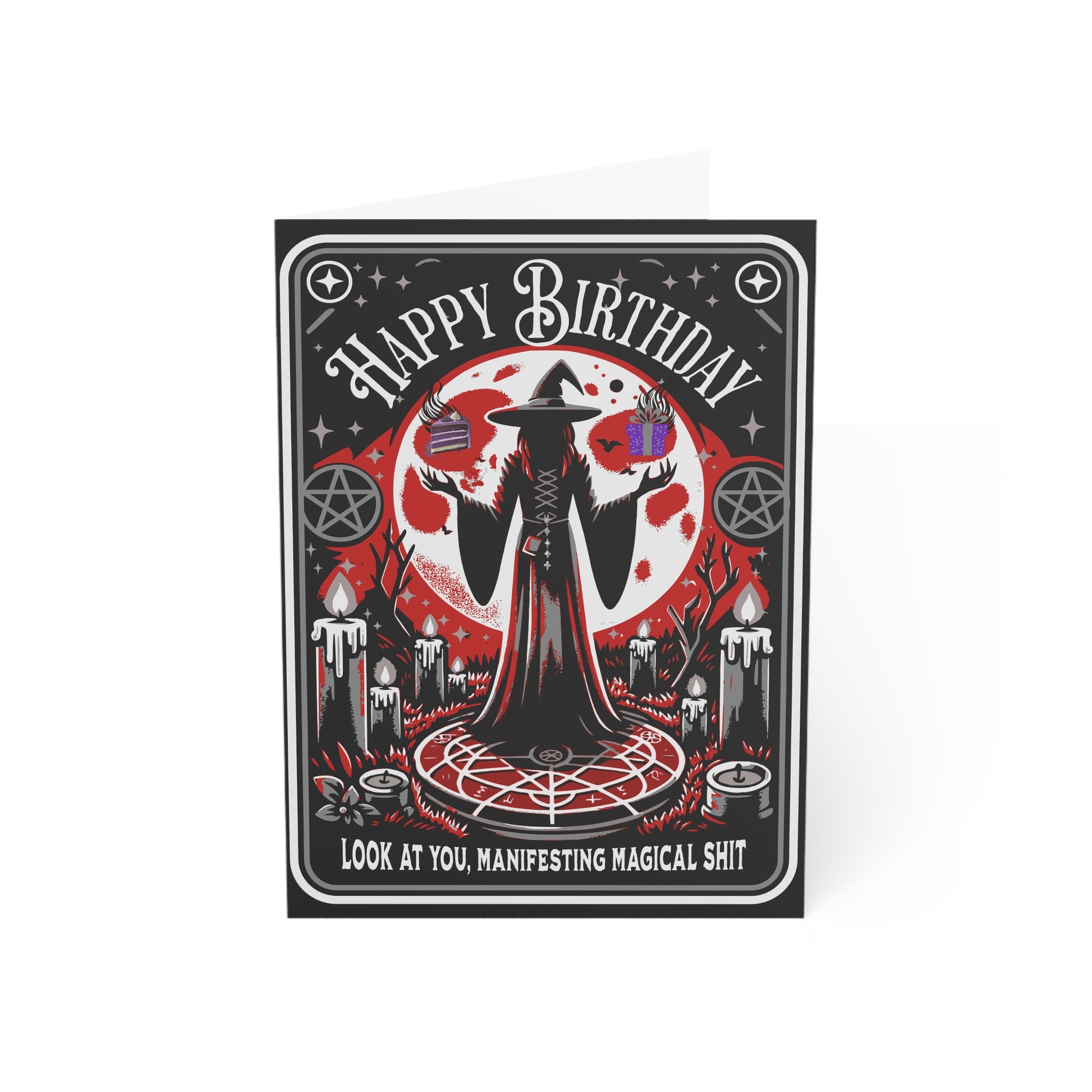 Send birthday magic with witchy mischief and gothic flair! This enchanting card features a charismatic witch mid-spell, conjuring presents, cake, candles, and swirling energy, surrounded by pastel florals, twisting trees, and Wiccan symbols.