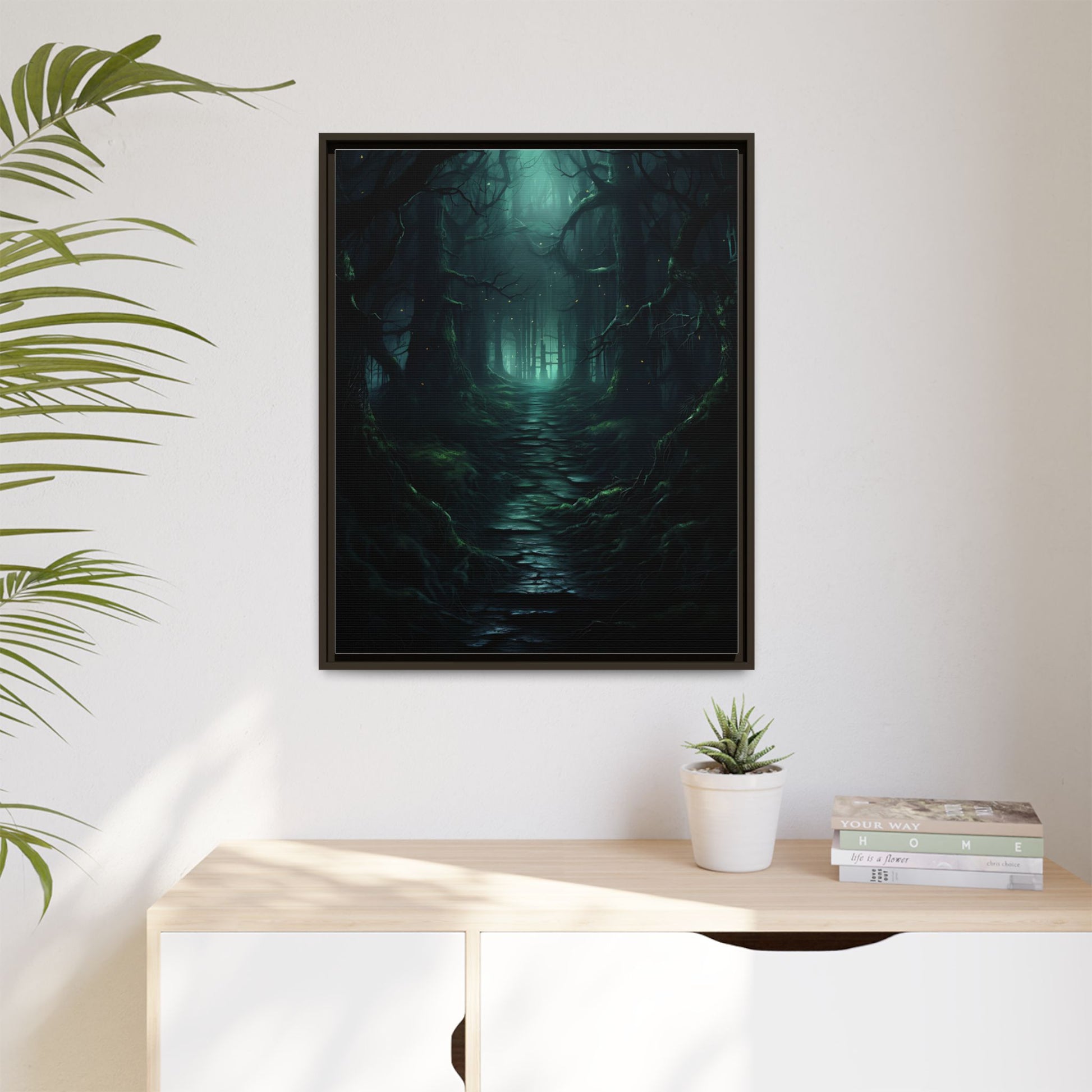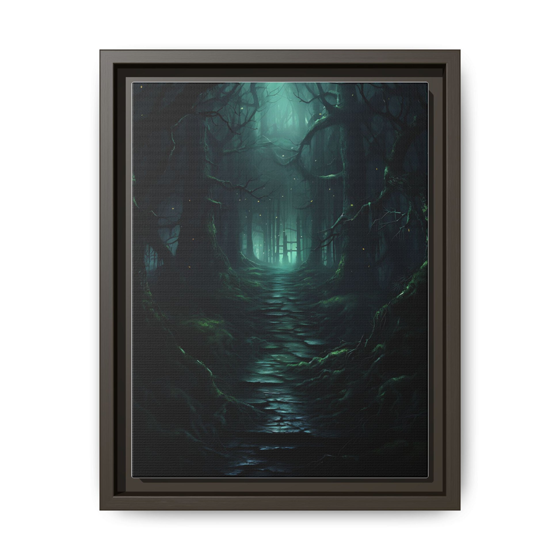 Venture into the shadows with “Path of the Forgotten,” a haunting gothic canvas art piece that captures the eerie stillness of an ancient forest path. Gnarled, moss-covered trees twist upward into the mist, their branches forming an ominous canopy. The faint glow of fireflies flickers among the shadows, guiding the eye down a winding, broken stone path that disappears into an ominous green-blue haze. This immersive dark art print conjures a mood both foreboding and enchanting—perfect for those who love the darker side of nature.