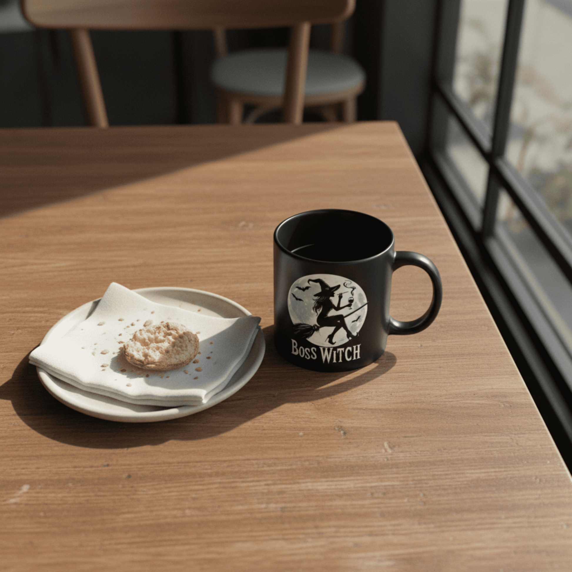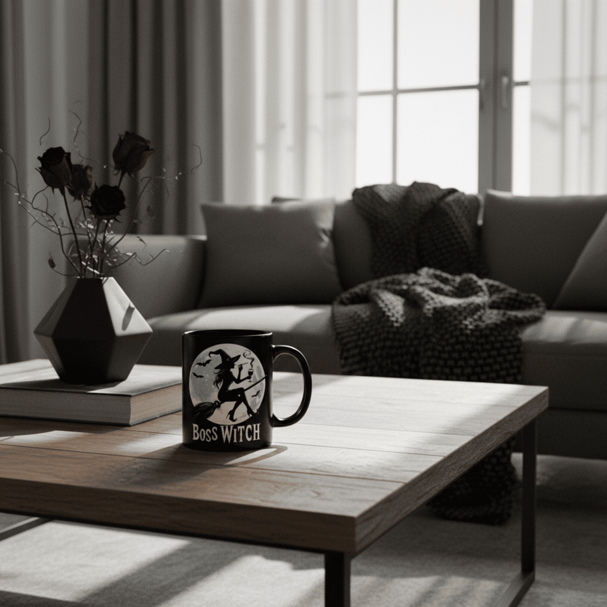 Elevate your morning ritual with the Boss Witch mug—a bold blend of gothic charm and empowerment. Featuring a confident witch gliding through the night sky in heels, clutching a glass of wine, this striking design celebrates success with style. A glowing full moon and fluttering bats complete the mystical aesthetic, making it the perfect statement piece.