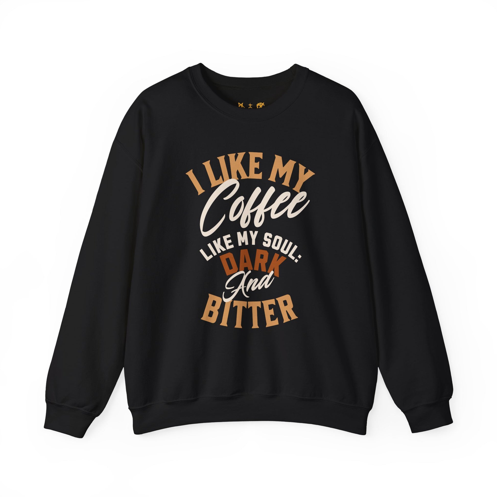 This sweatshirt features the text "I Like My Coffee Like My Soul: Dark and Bitter" which is perfect for caffeine-fueled nights and moody mornings. This shirt is made for those who embrace their dark side—whether in style, humor, or just their coffee preference. Pair it with your favorite jeans, sip your strongest brew, and tell the world you take your caffeine (and attitude) black. Stay dark, stay caffeinated.