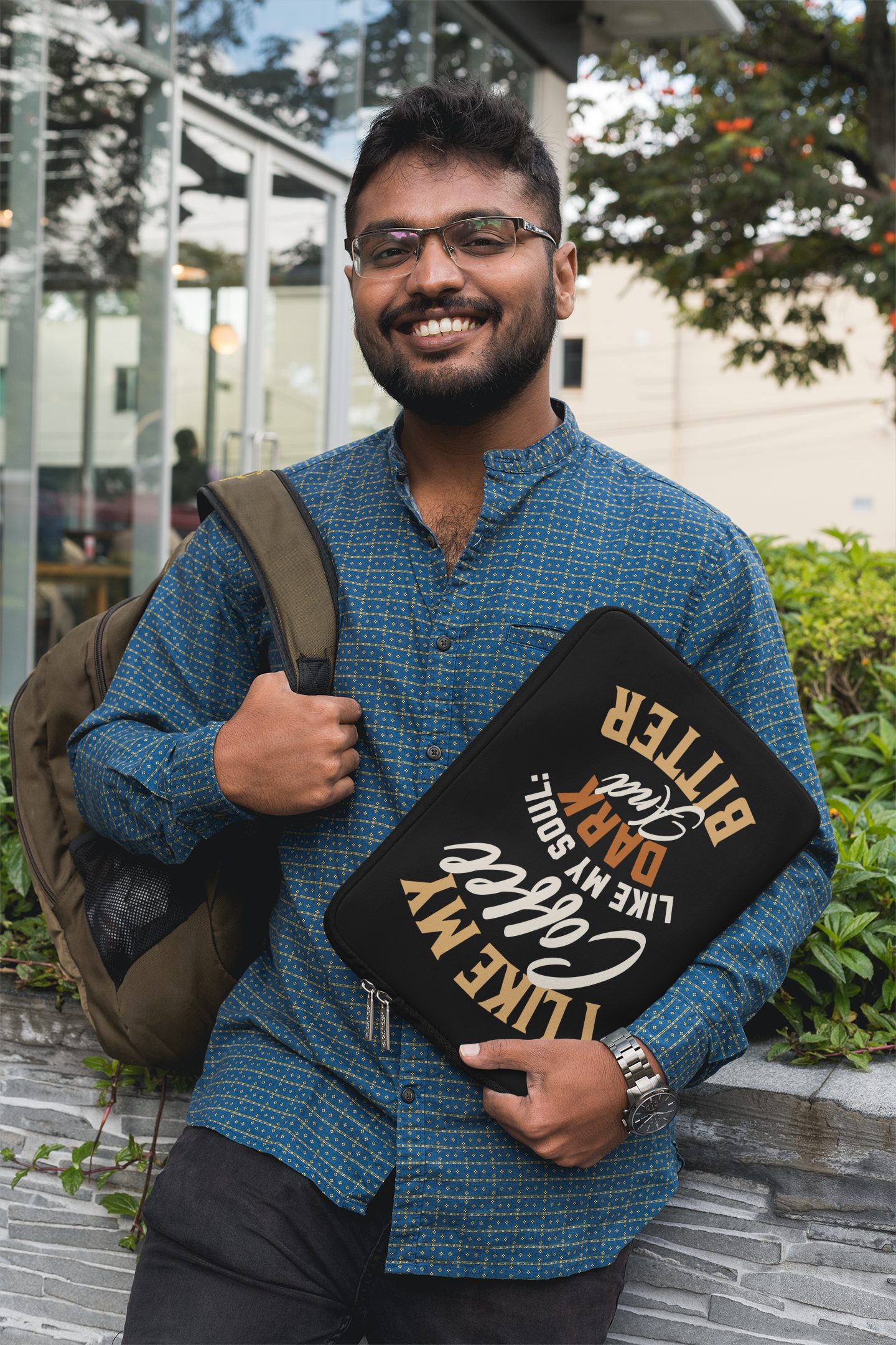 This laptop sleeve features the text "I Like My Coffee Like My Soul: Dark and Bitter," perfect for caffeine-fueled nights and moody mornings. This case is made for those who embrace their dark side—whether in style, humor, or just their coffee preference. Sip your most potent brew and tell the world you take your caffeine (and attitude) black. Stay dark, stay caffeinated.