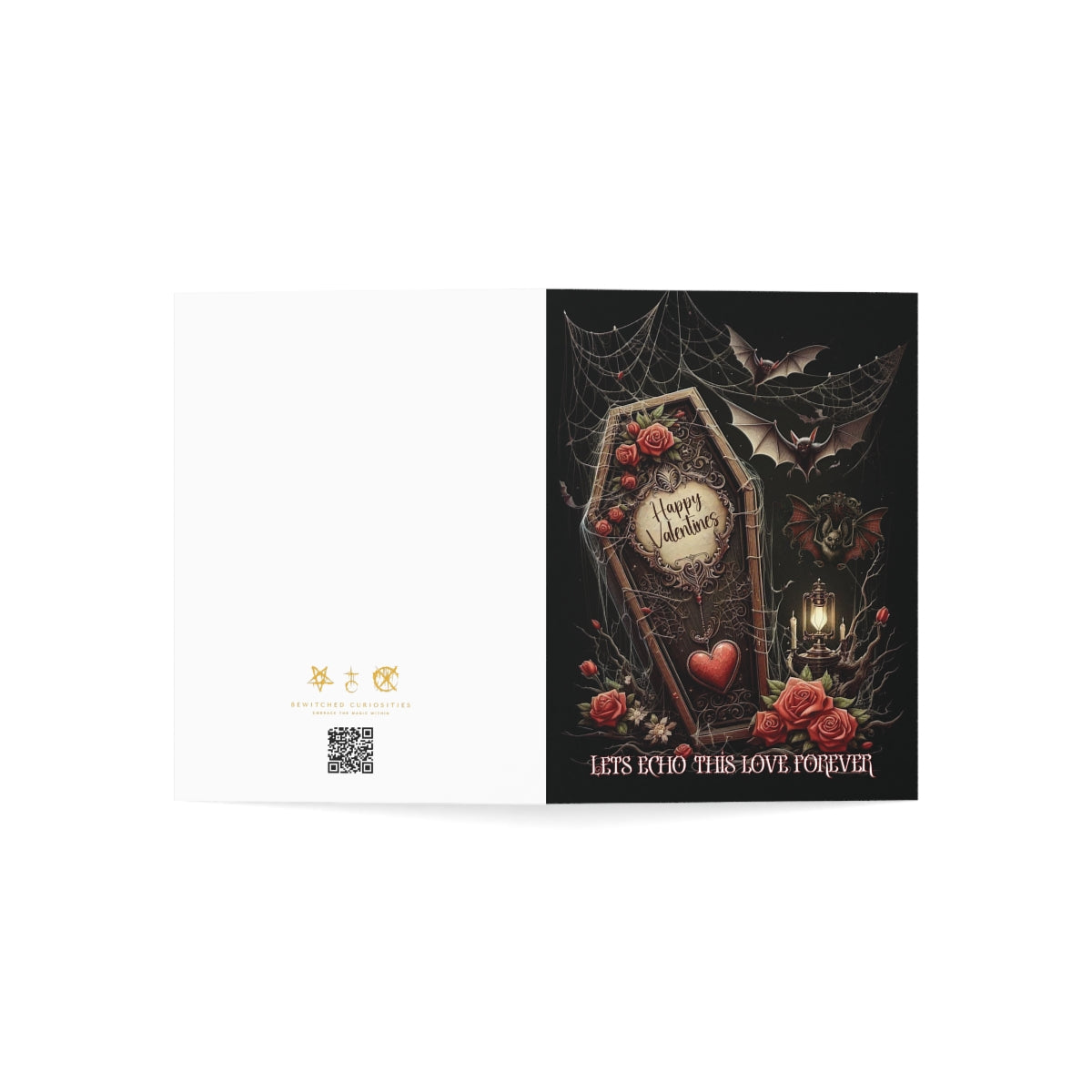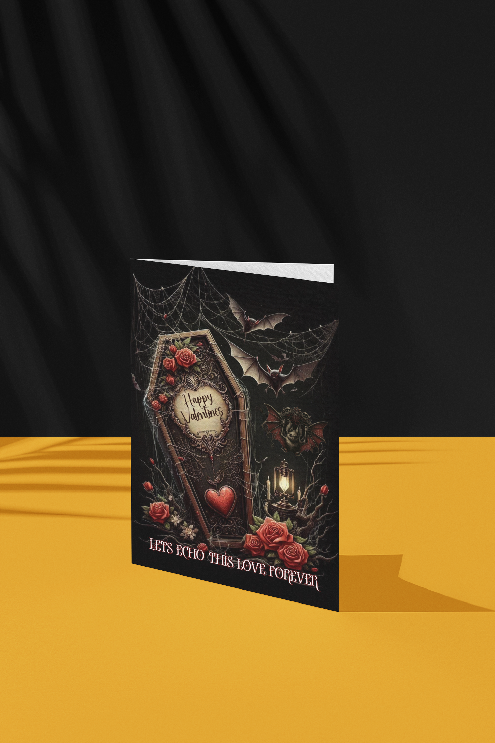 This captivating Valentine’s Day card features an intricately designed coffin adorned with lush red roses, verdant green foliage, and elegant gothic-Victorian carvings. A striking plaque at the heart of the coffin lid reads "Happy Valentines," with a beautiful red heart pendant hanging beneath it. Surrounding the coffin are more roses, glowing candles, twigs, and a vintage Victorian gas lamp that adds an atmospheric charm. Bats flit through the scene, weaving between cobwebs draped delicately over the coffin and hanging from the ceiling. At the base of the design, the romantic phrase "Let’s Echo This Love Forever" completes the hauntingly beautiful imagery. This piece is perfect for anyone who loves gothic romance, dark aesthetics, or Victorian-inspired designs!