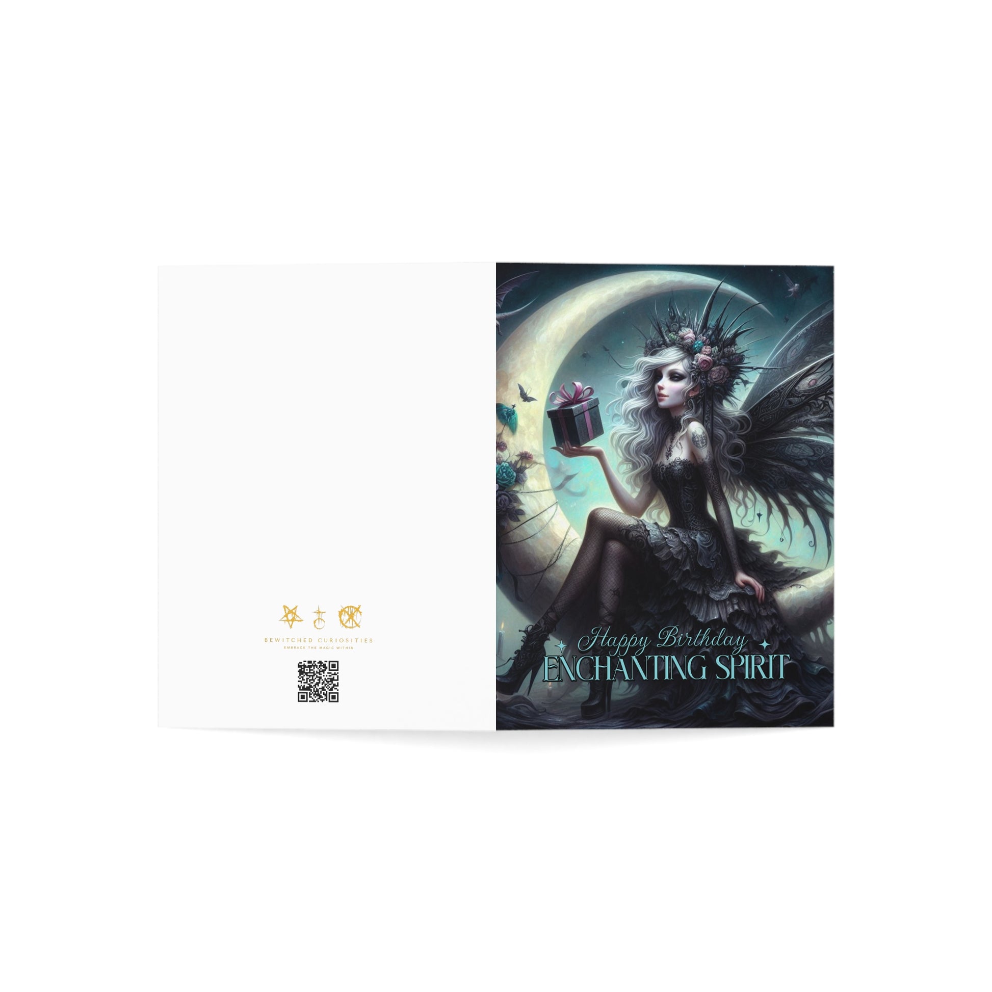 Celebrate someone spellbinding with a card that captures dark enchantment and fairy-tale whimsy. "Enchanting Spirit" features a gothic fairy perched on a glowing crescent moon, wrapped in a corseted gown and heels. Her tattooed arm cradles a ribboned gift, and her wings shimmer like lace spun from moonlight.