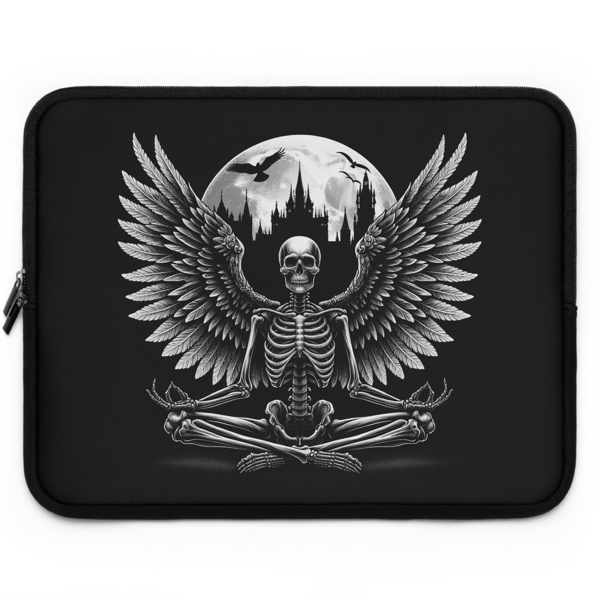 Find your balance between darkness and serenity with our Eternal Balance laptop sleeve. This striking black sleeve features a winged skeleton in a meditative yoga pose, symbolizing the harmony between life, death, and transformation. Perfect for those who embrace both their gothic edge and their inner peace, this design blends dark aesthetics with spiritual energy in a truly unique way. Even the undead deserve a moment of zen!