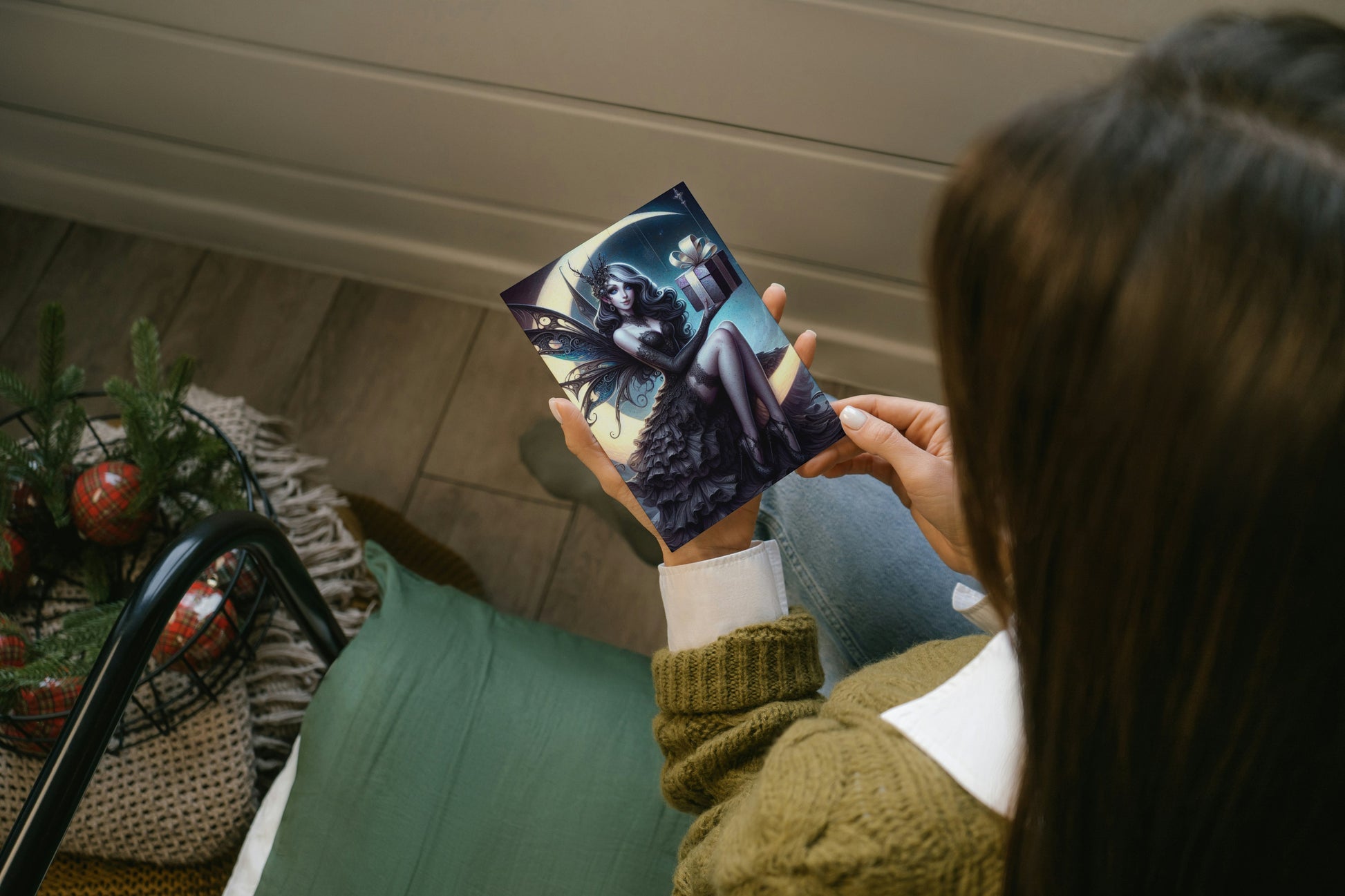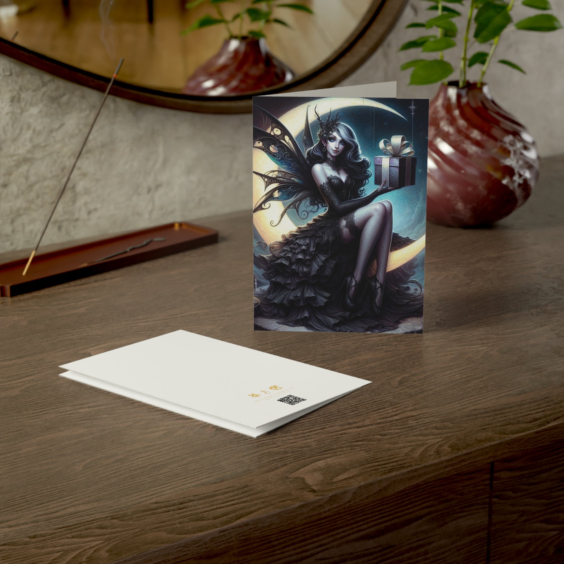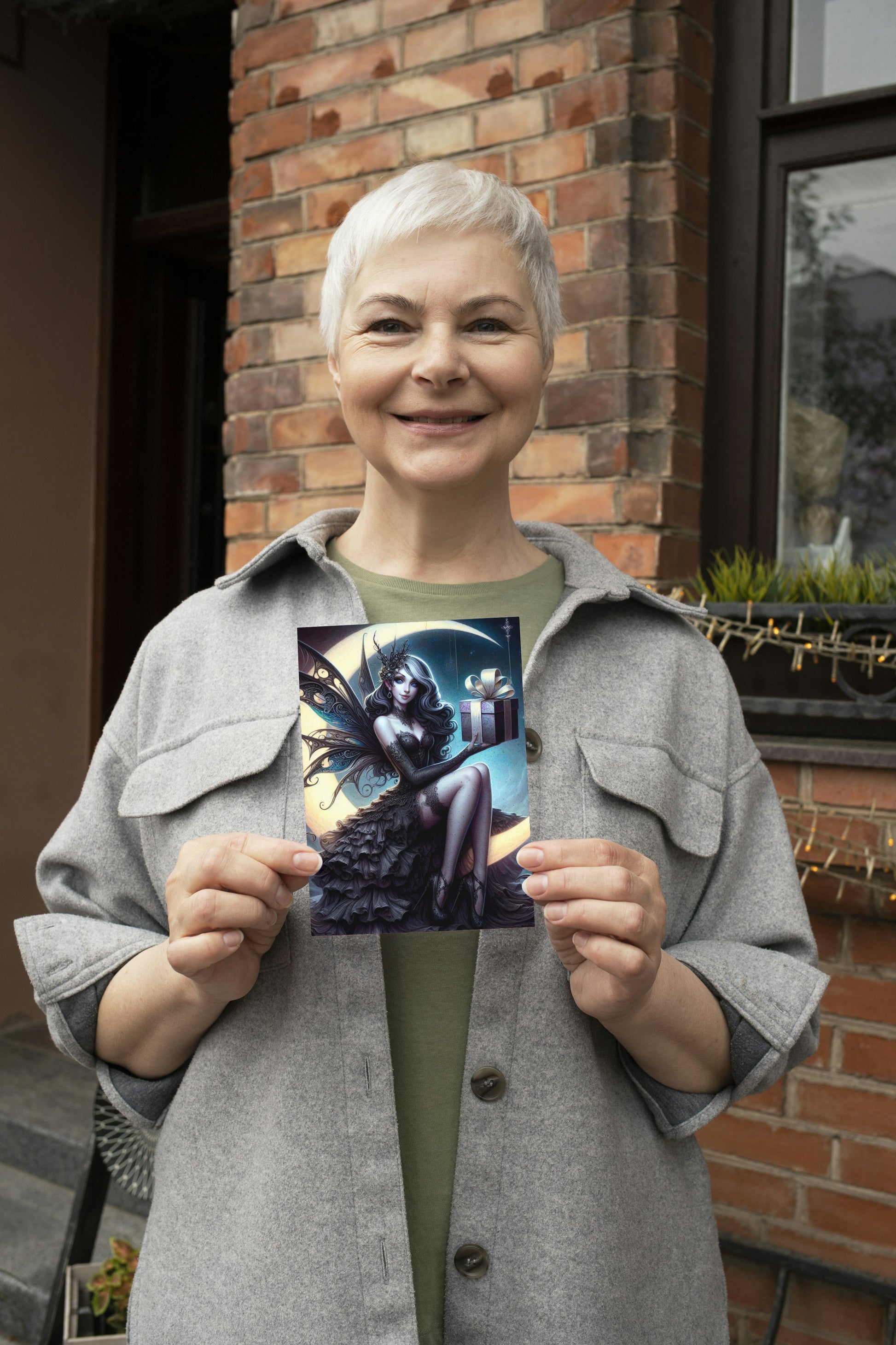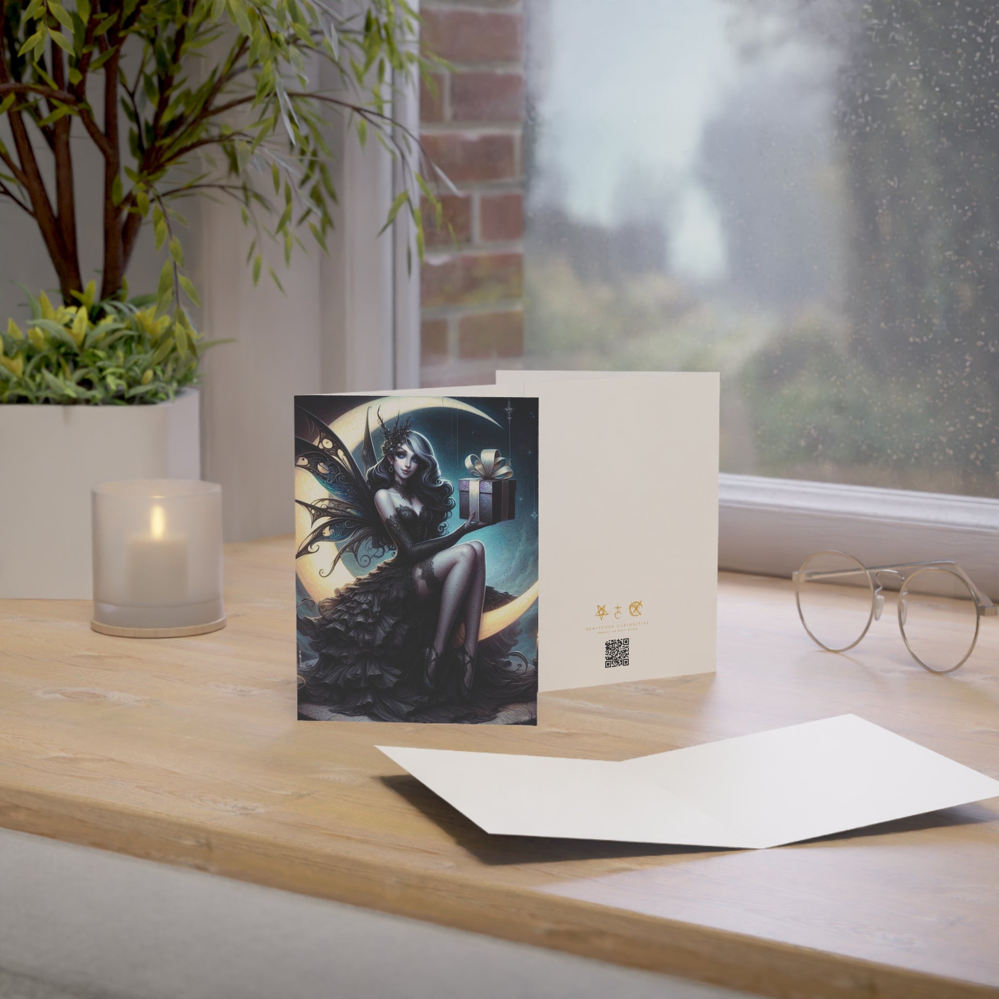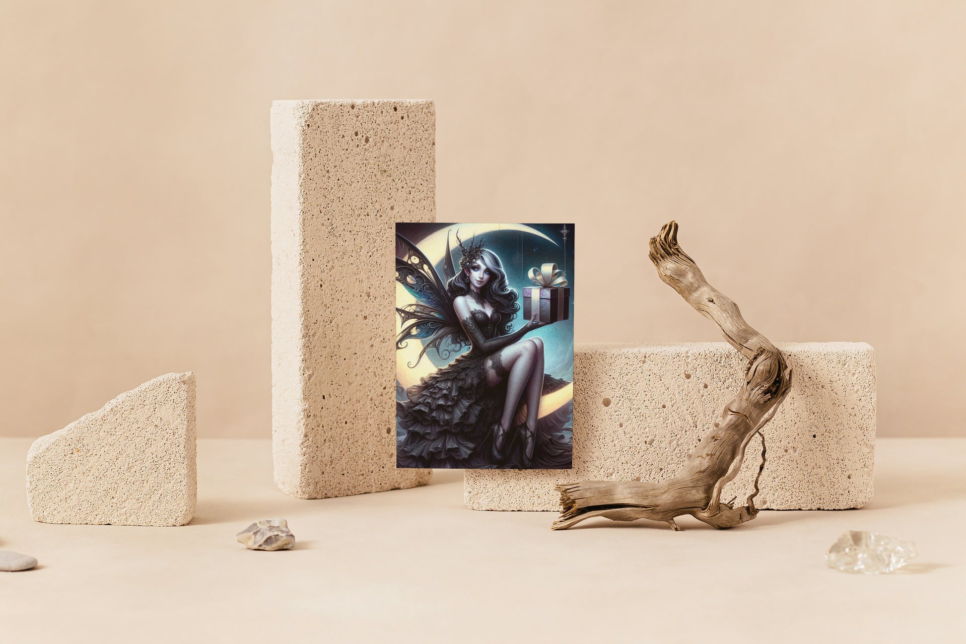 Step into moonlit enchantment with this gothic fairy greeting card. Featuring an ethereal fairy perched on a glowing crescent moon, she exudes elegance and mystery, cradling a ribbon-wrapped gift as a symbol of celebration and connection.