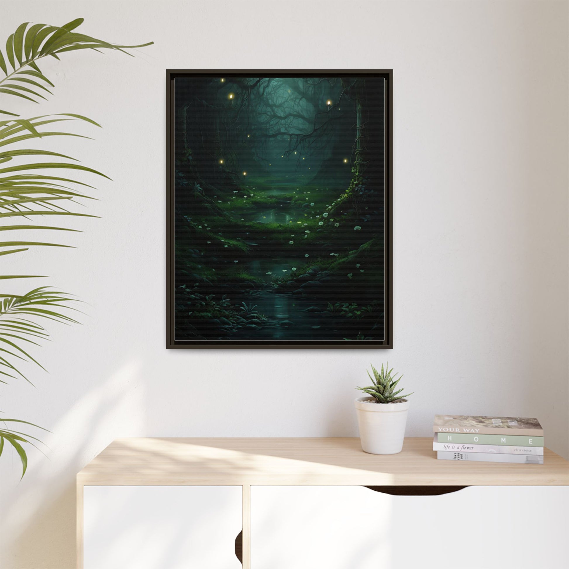 Step into moonlit enchantment and untamed mystery with this gothic canvas print, where fireflies drift above a glowing river, illuminating twisted trees and tangled vines in haunting hues of green and blue.