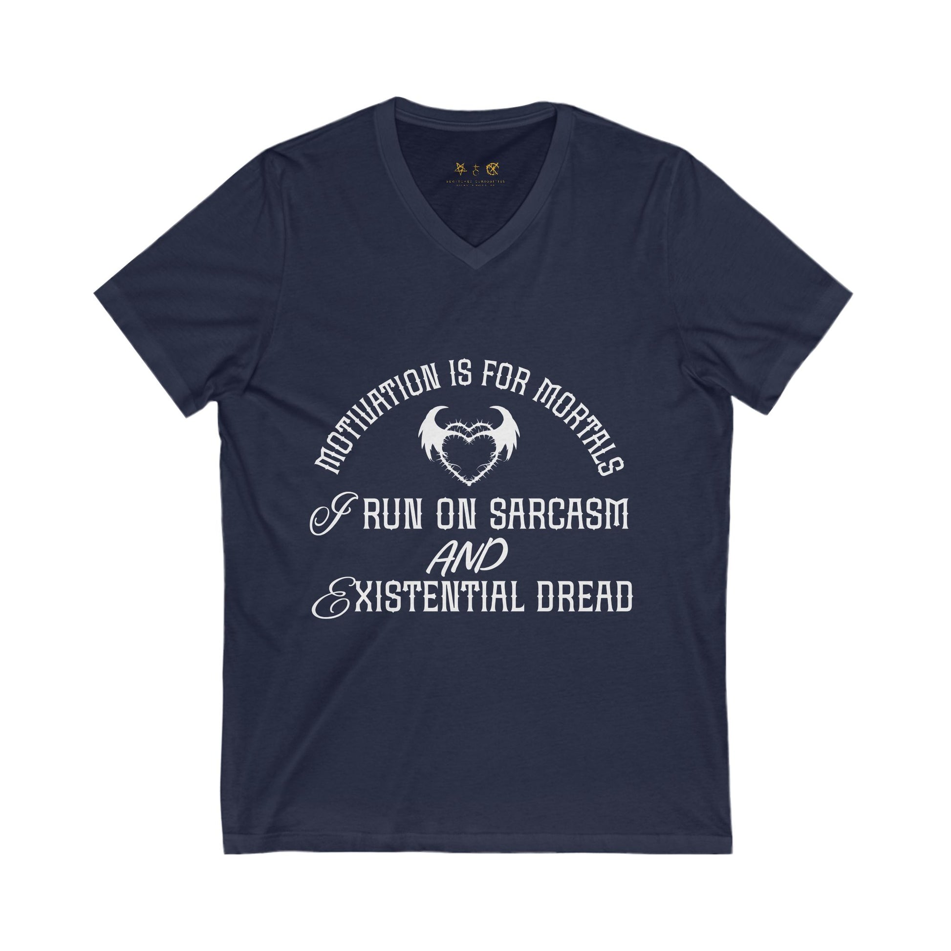 A bold and witty t-shirt for those who thrive on sarcasm and a healthy dose of existential dread. Featuring the phrase "Motivation is for mortals. I run on sarcasm and existential dread," this design is perfect for anyone who prefers dark humor over empty pep talks. Whether you're navigating the daily grind, embracing life's absurdity, or just letting the world know you operate on your own terms, this tee has you covered.