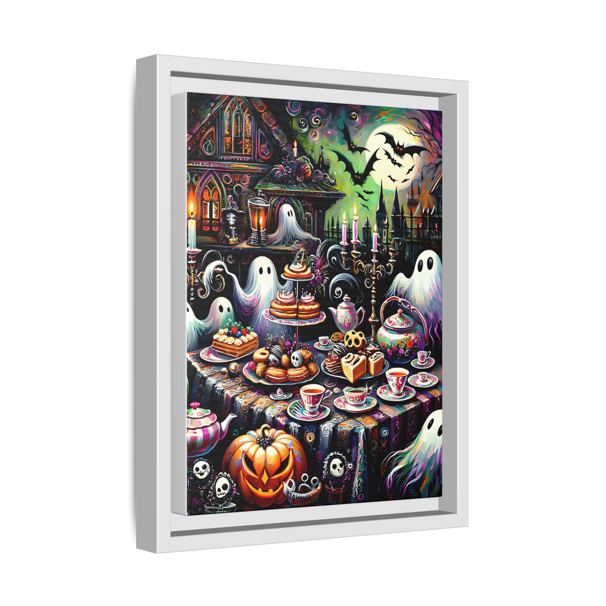 Add a dash of gothic whimsy to your walls with "Haunted Tea Party", a vibrant canvas print brimming with spooky charm. The scene features a magical tea table overflowing with treats, where cheerful ghosts gather beneath fluttering bats for a delightfully haunted celebration.