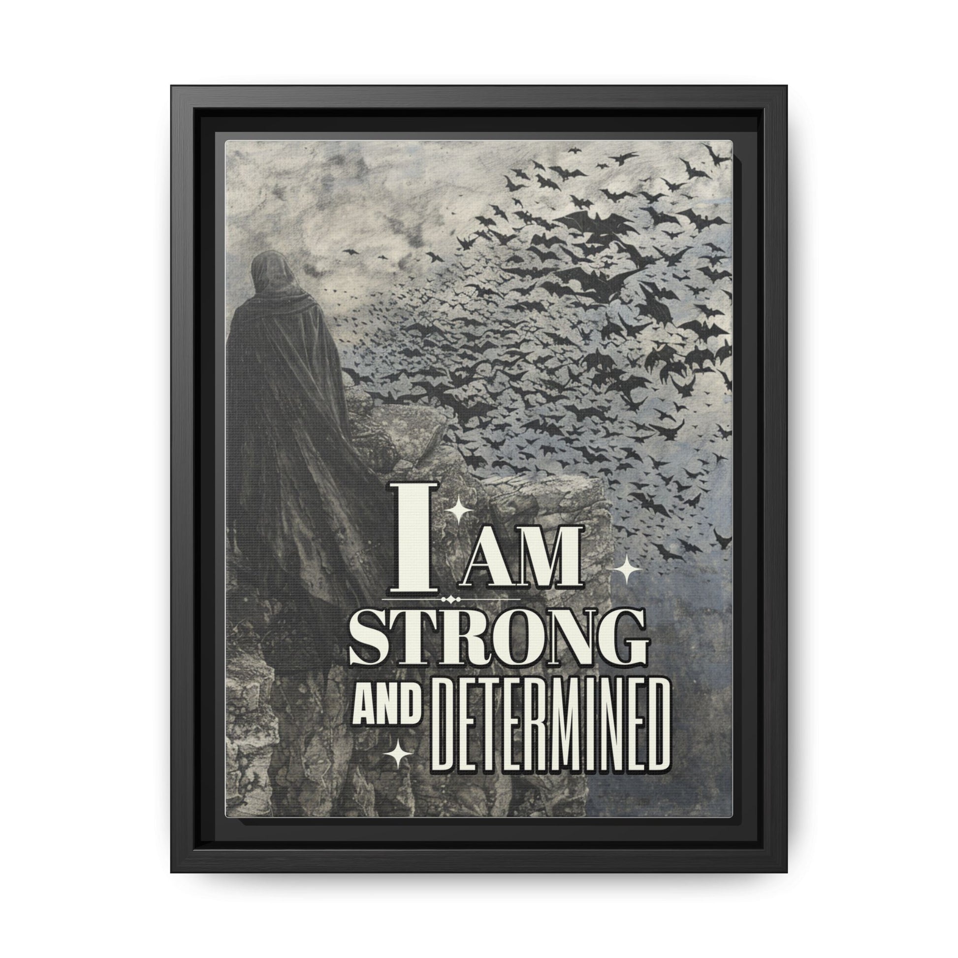 Add an air of mystery and empowerment to your space with this striking gothic canvas wall art, featuring a cloaked figure standing at the edge of a cliff, back turned to the viewer. From the figure's silhouette, a dramatic plume of bats bursts forth into a moonlit sky—symbolizing freedom, release, and powerful transformation. The bold affirmation, "I am strong and determined," delivers a daily dose of gothic motivation, reminding you of your resilience, courage, and unwavering inner strength.