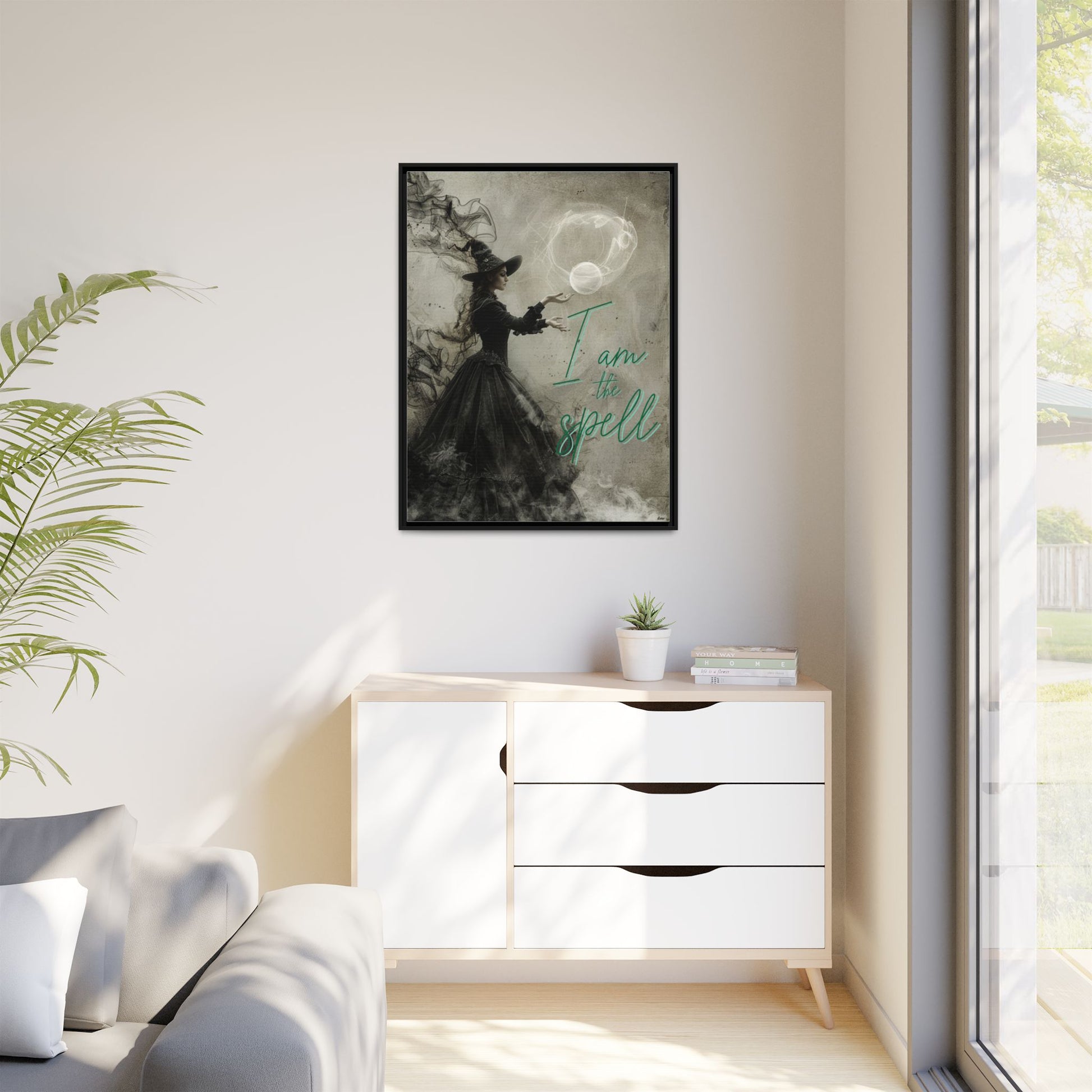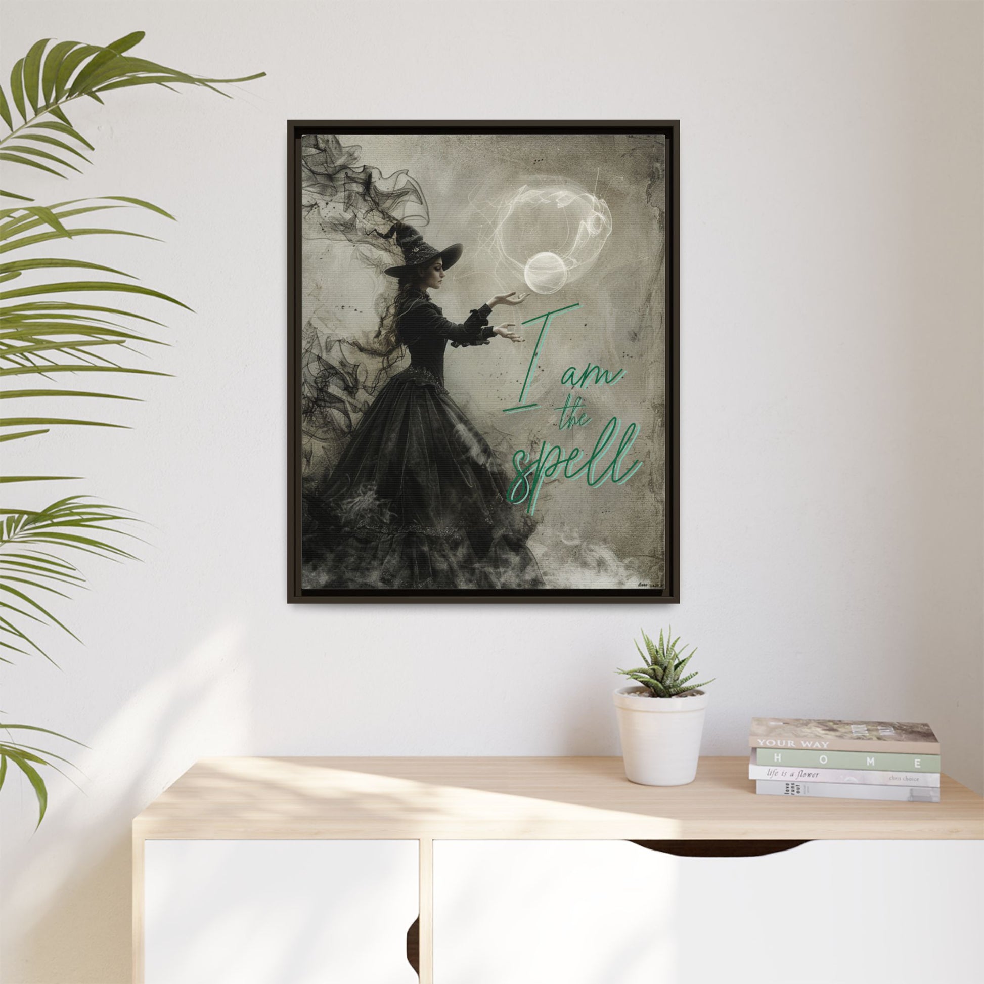 Bring magic into your space with this enchanting gothic canvas wall art, featuring an ethereal witch casting a spell, surrounded by swirling smoke and illuminated in a ghostly glow. The bold affirmation, “I am the spell,” radiates self-belief, inner power, and spiritual transformation—making this a perfect piece for those drawn to gothic motivational quotes and witchy art that celebrates personal empowerment.
