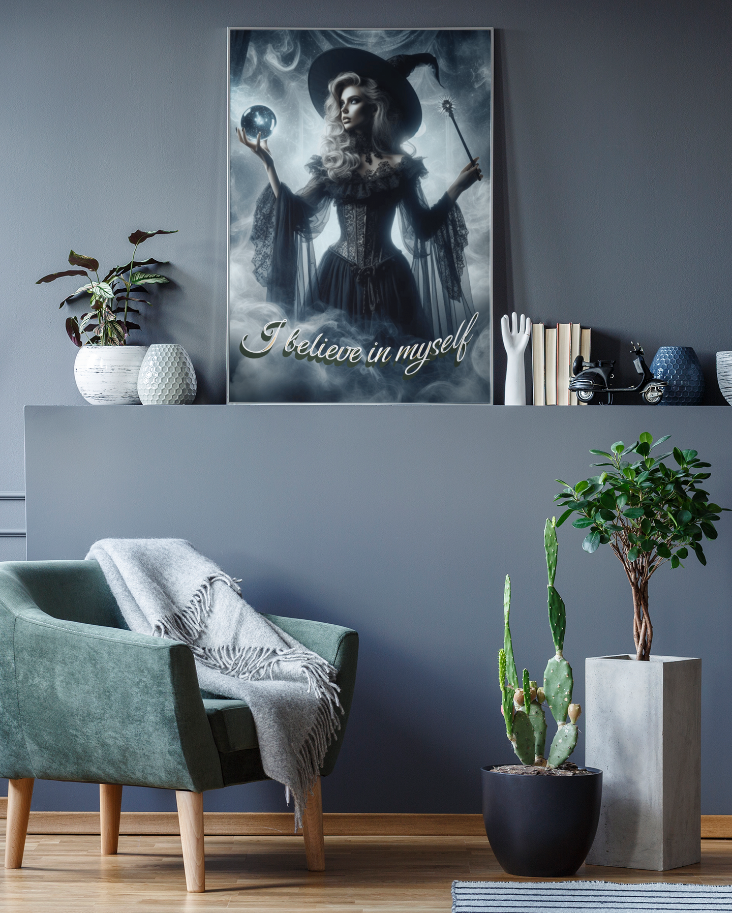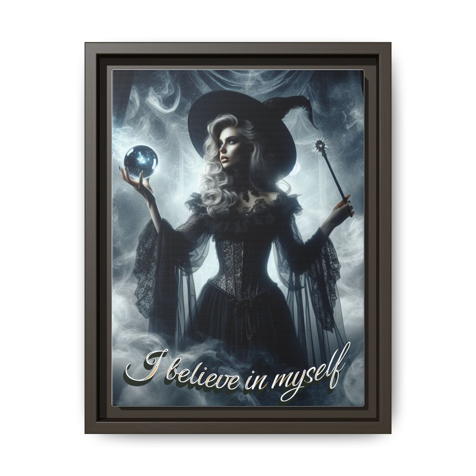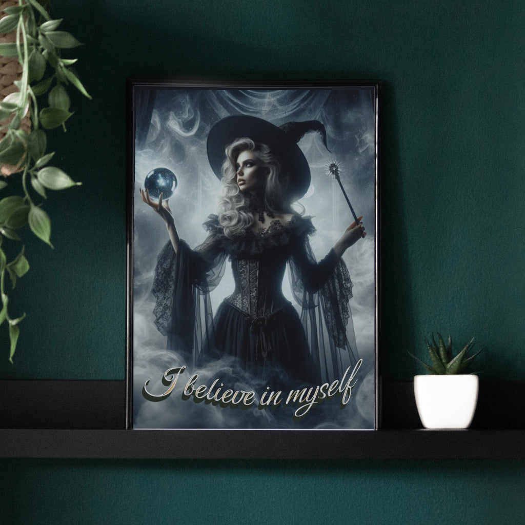 Celebrate strength and self-belief with this enchanting gothic canvas art, featuring a young witch standing proudly at the center of the scene. She wears a flowing Victorian-style corseted gown and a classic witch’s hat, exuding timeless gothic elegance. Her long blonde hair frames a determined expression as she holds a glowing crystal ball in one hand and a wand in the other. Wisps of ethereal smoke swirl around her, creating a dreamy, mystical atmosphere. Paired with the affirmation "I believe in myself," this artwork radiates gothic inspiration, encouraging you to embrace your unique gifts and step into your power.