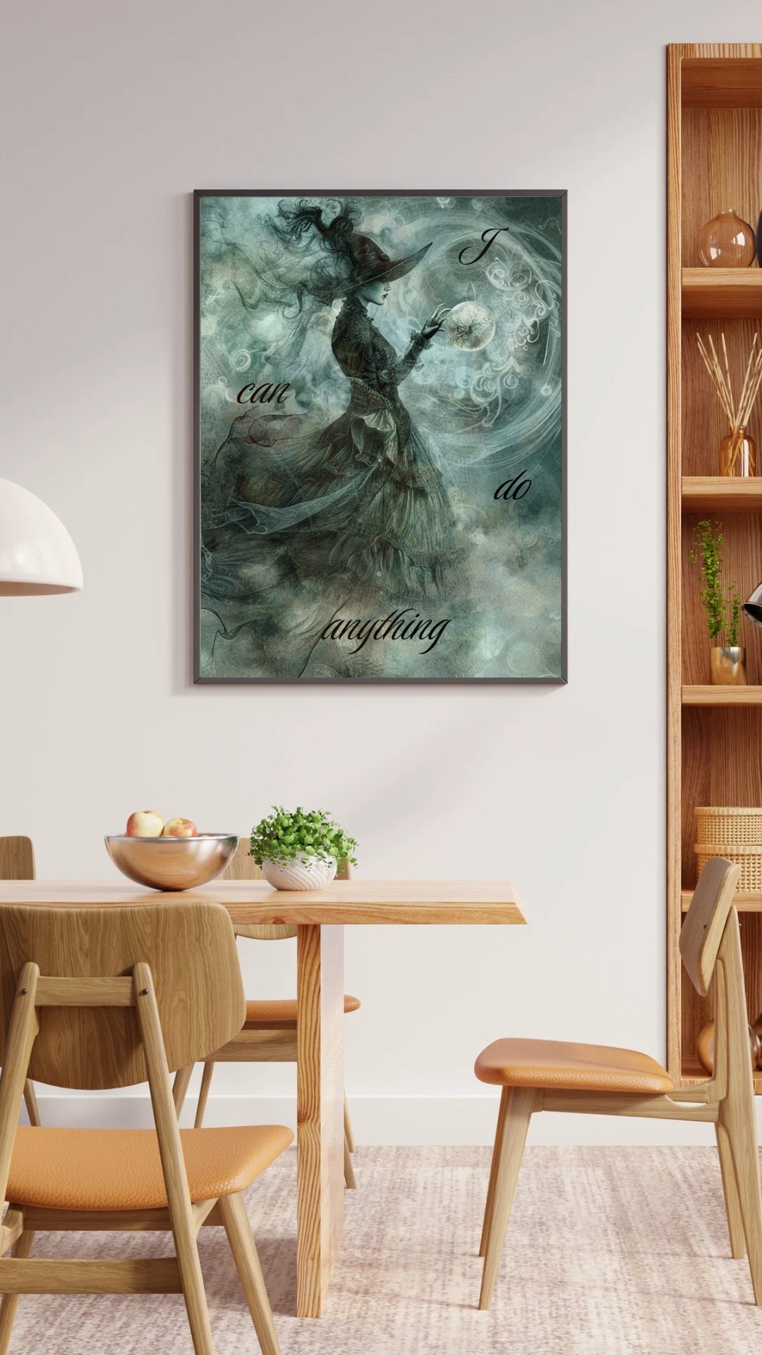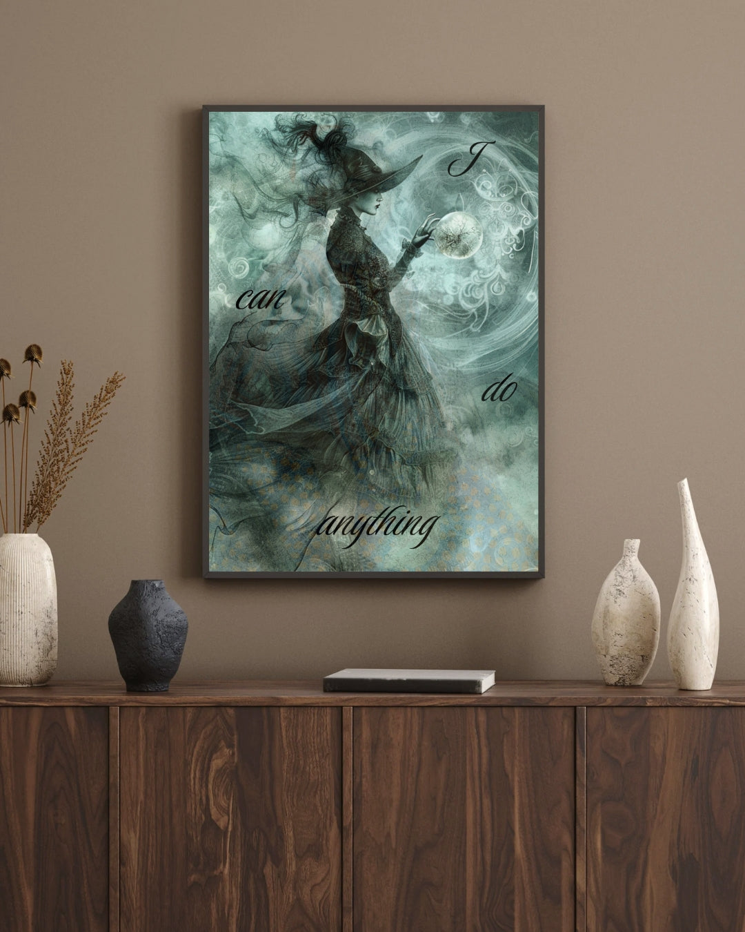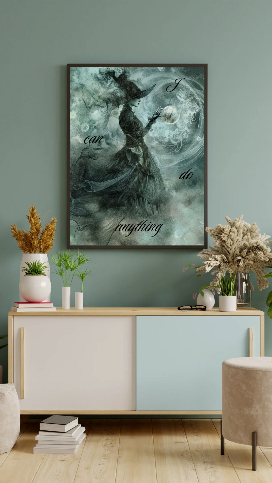 Step into your power with this ethereal gothic canvas art featuring the bold affirmation: I can do anything. A poised witch in flowing dark attire conjures energy from a glowing orb, her silhouette cloaked in swirling mist and celestial designs. This mesmerizing witchy art print blends elegance and mysticism, casting an aura of strength, intention, and infinite potential.