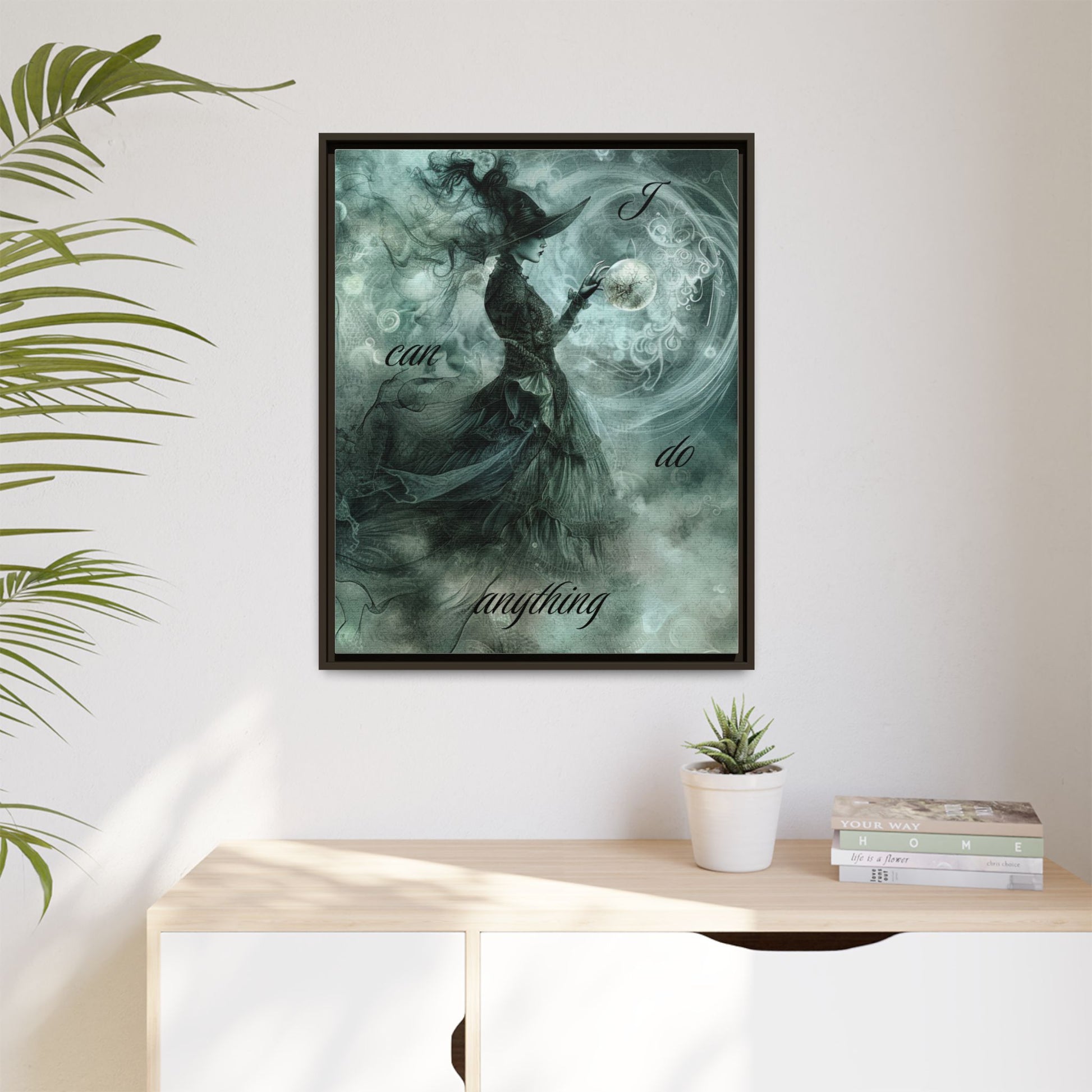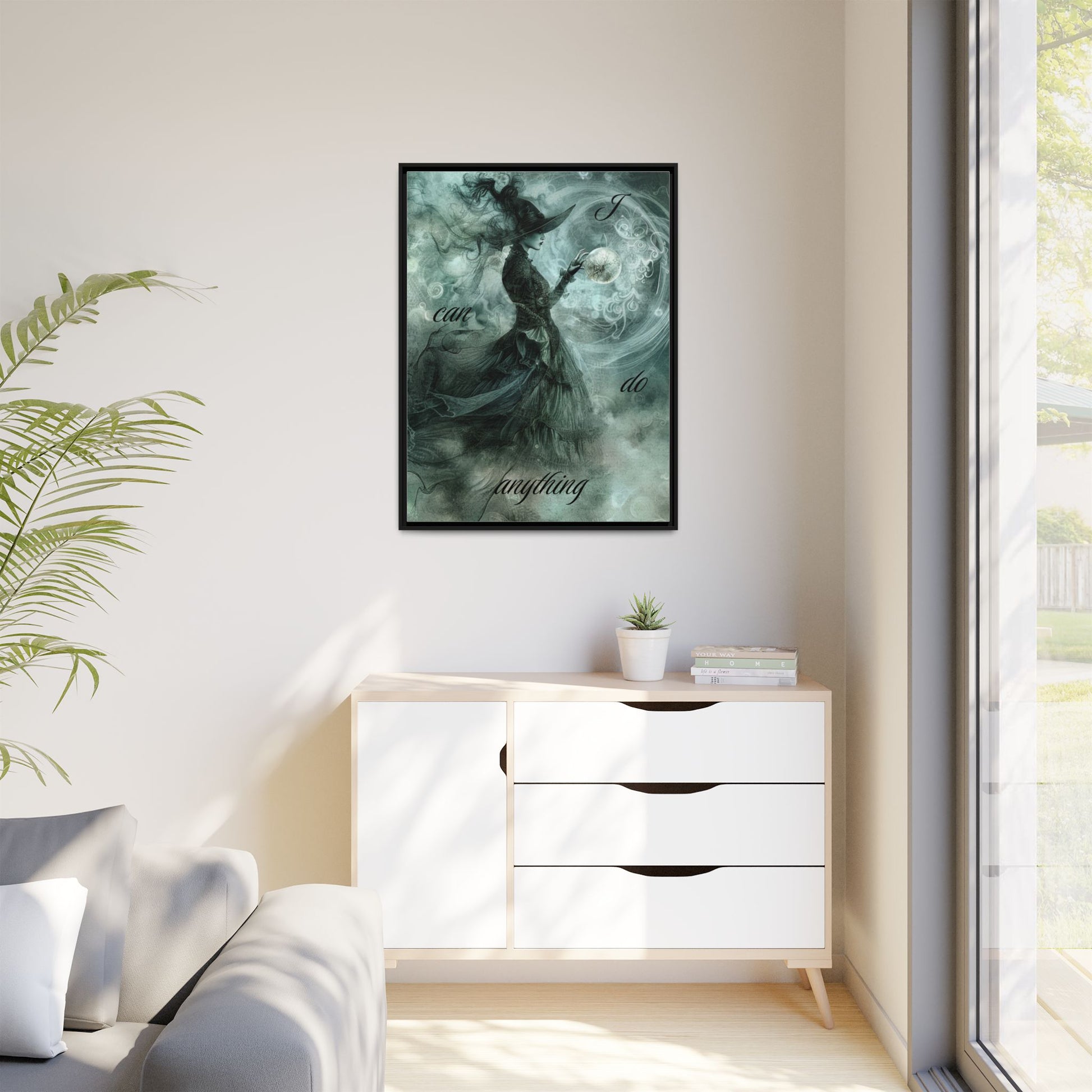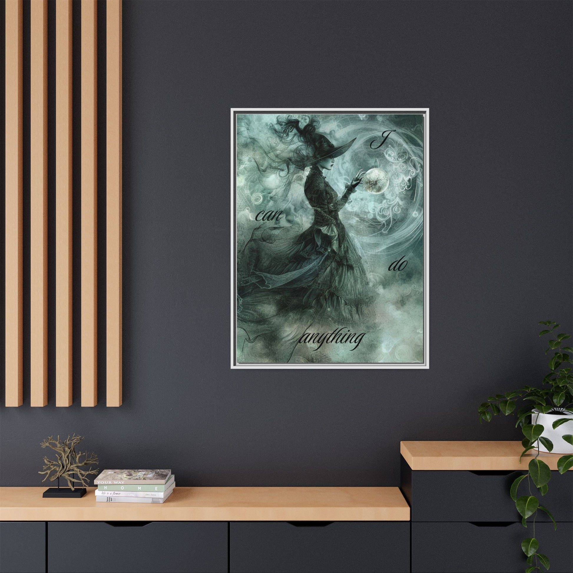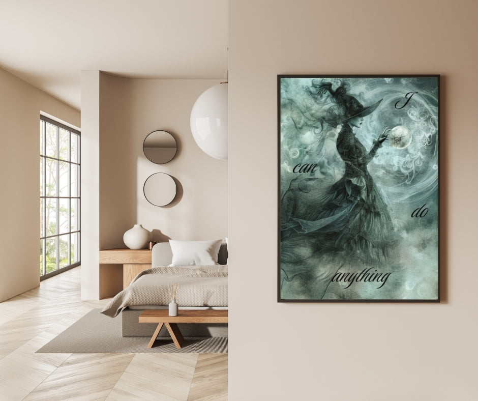 Step into your power with this ethereal gothic canvas art featuring the bold affirmation: I can do anything. A poised witch in flowing dark attire conjures energy from a glowing orb, her silhouette cloaked in swirling mist and celestial designs. This mesmerizing witchy art print blends elegance and mysticism, casting an aura of strength, intention, and infinite potential.