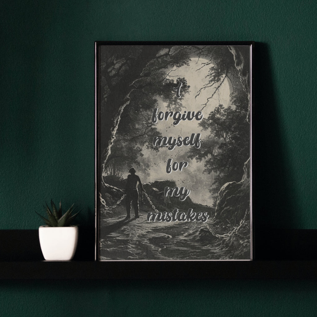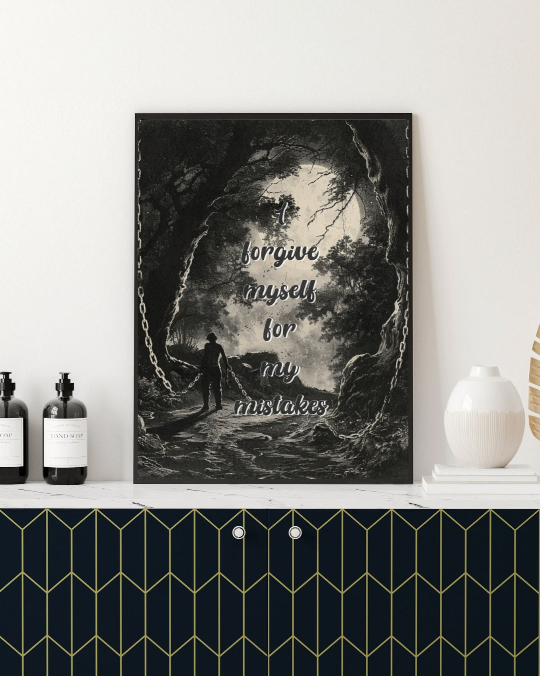 This gothic canvas wall art features a man bound in chains in an eerie forest, paired with a gothic positive affirmation that inspires strength, transformation, and affirmation positive energy. A striking piece for those drawn to gothic motivation, empowering positive affirmations, or dark goddess affirmations, it adds emotional depth to your decor while serving as a daily reminder of resilience.