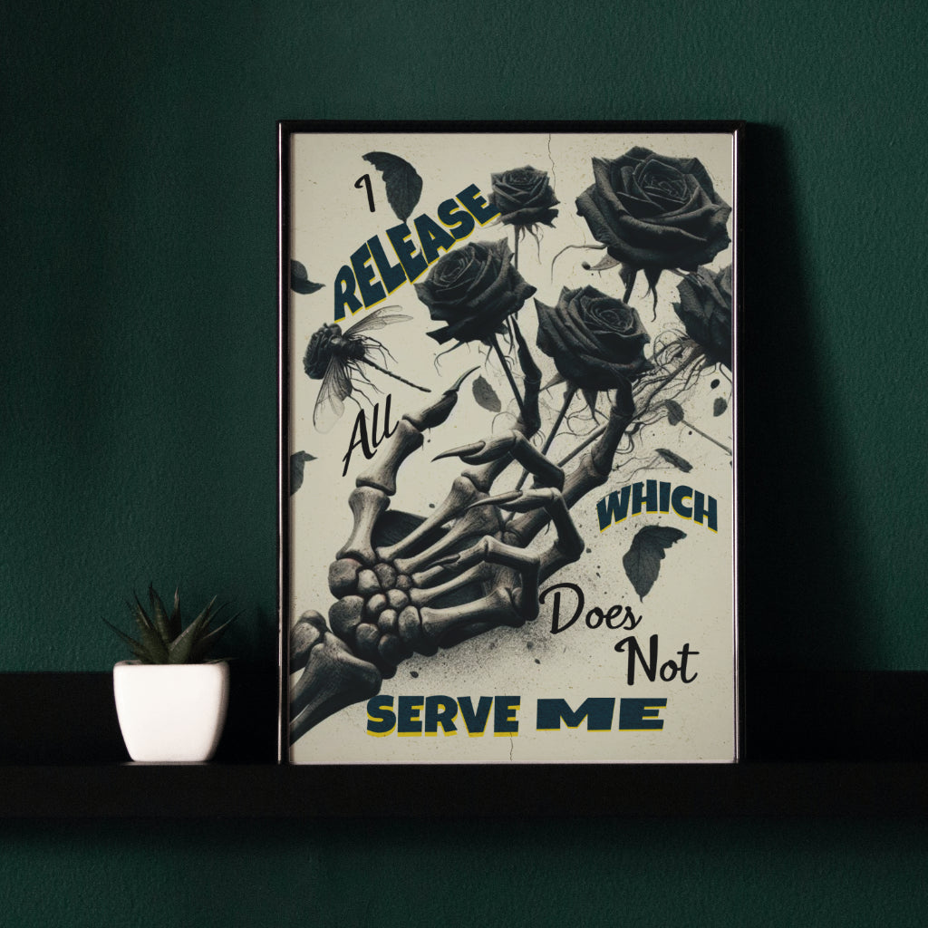 Release the weight of the past and invite transformation with this hauntingly beautiful gothic canvas print. Featuring a skeletal hand reaching toward a bouquet of black roses, their delicate petals drifting away, this artwork symbolizes the quiet strength found in letting go. The powerful affirmation, “I release all which does not serve me,” offers a message of healing and self-empowerment—making this an evocative centerpiece for any gothic home decor collection.