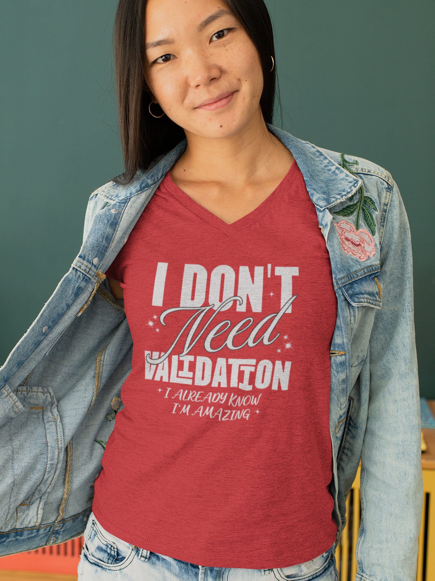 The front features the empowering text "I Don't Need Validation; I Already Know I'm Amazing," adding a playful, thoughtful touch to this gothic graphic t-shirt. Whether you're shopping gothic t-shirts for women, gothic t-shirts for men, or looking to add to your collection of gothic graphic tees, this design is a standout choice. It blends seamlessly into alternative wardrobes, pairing well with ripped jeans, layered jewelry, or your favorite boots.