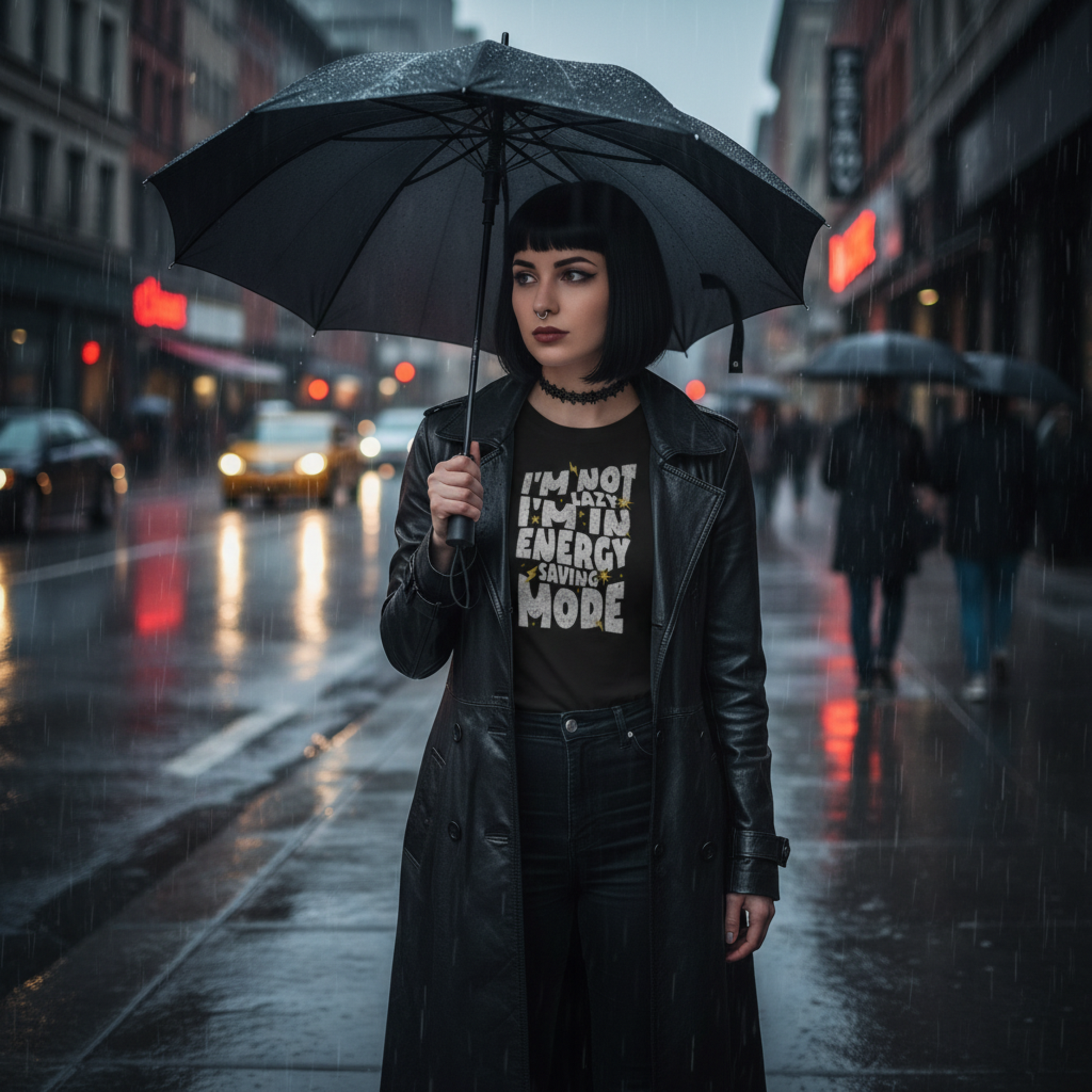 Proudly made in the USA under Fair Labor Association guidelines, this quality gothic clothing item ensures you not only look good but feel good about your purchase. The front text, "I'm Not Lazy; I'm In Energy Saving Mode," brings a playful, cheeky energy, while the back showcases a beautifully detailed watercolor-style illustration of a relaxed skeleton—making this a gothic t-shirt design that truly stands out.