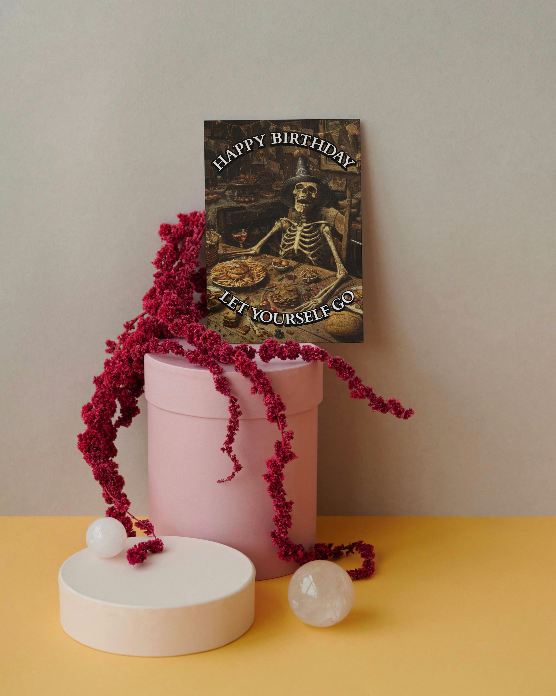 Celebrate with spooky charm and dark humor! This whimsigoth-inspired birthday card features an overindulgent skeleton seated at a decadent party table, dressed in a witch’s hat, glass of wine in hand, surrounded by sweet treats and flickering candles.