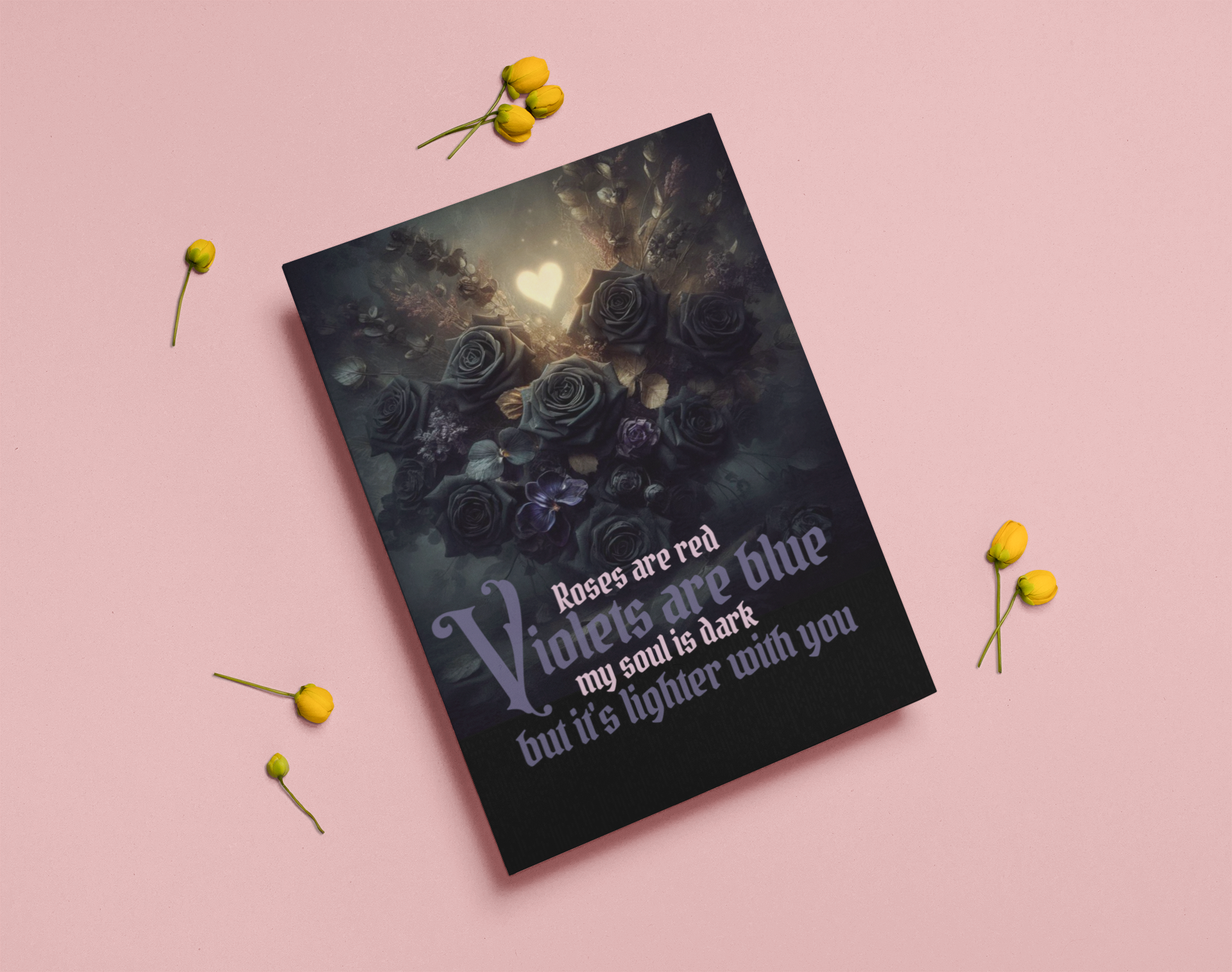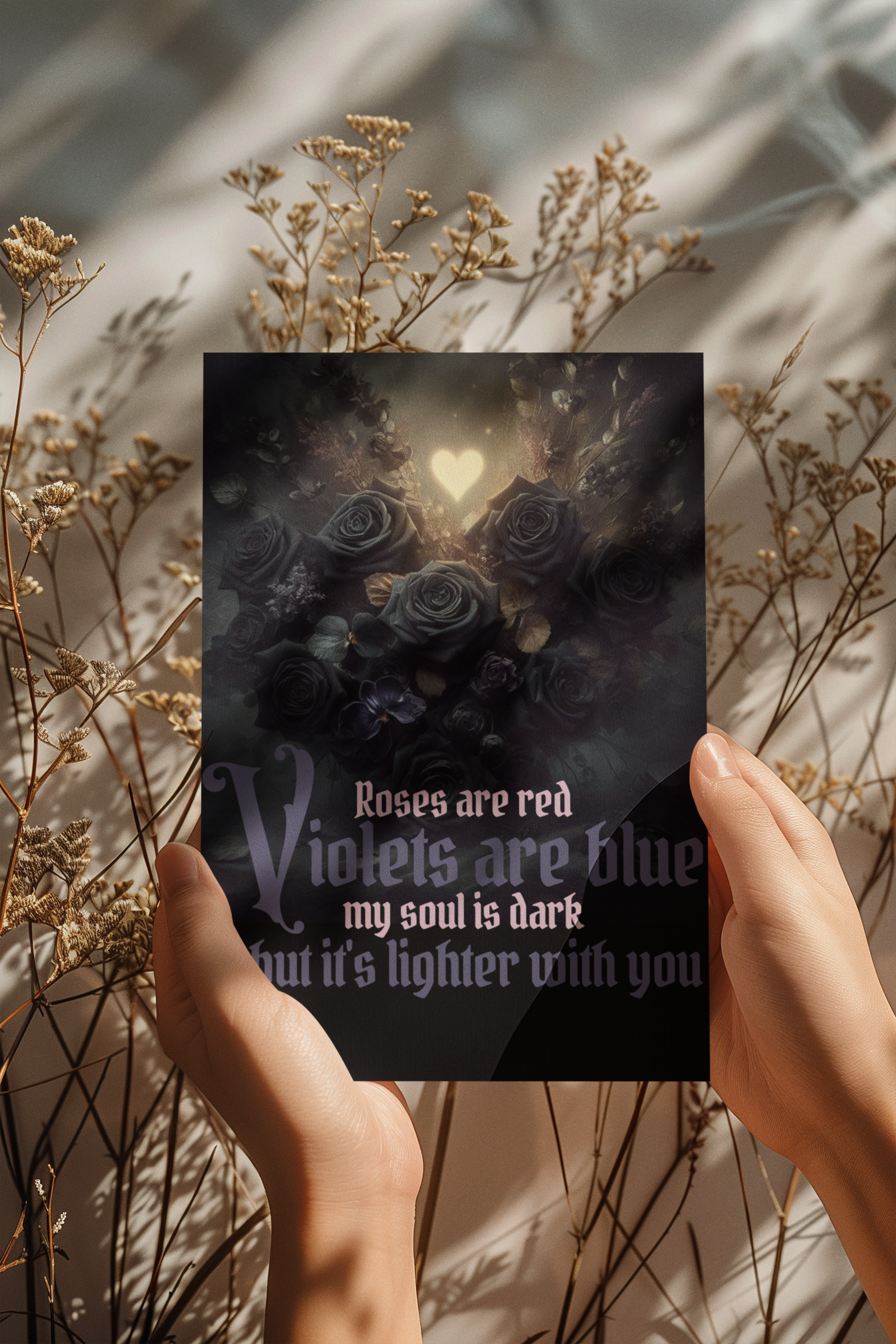 A softly glowing heart casts light through the shadows, while the phrase "Roses are red, violets are blue, my soul is dark, but it’s lighter with you" adds a poetic, introspective touch.