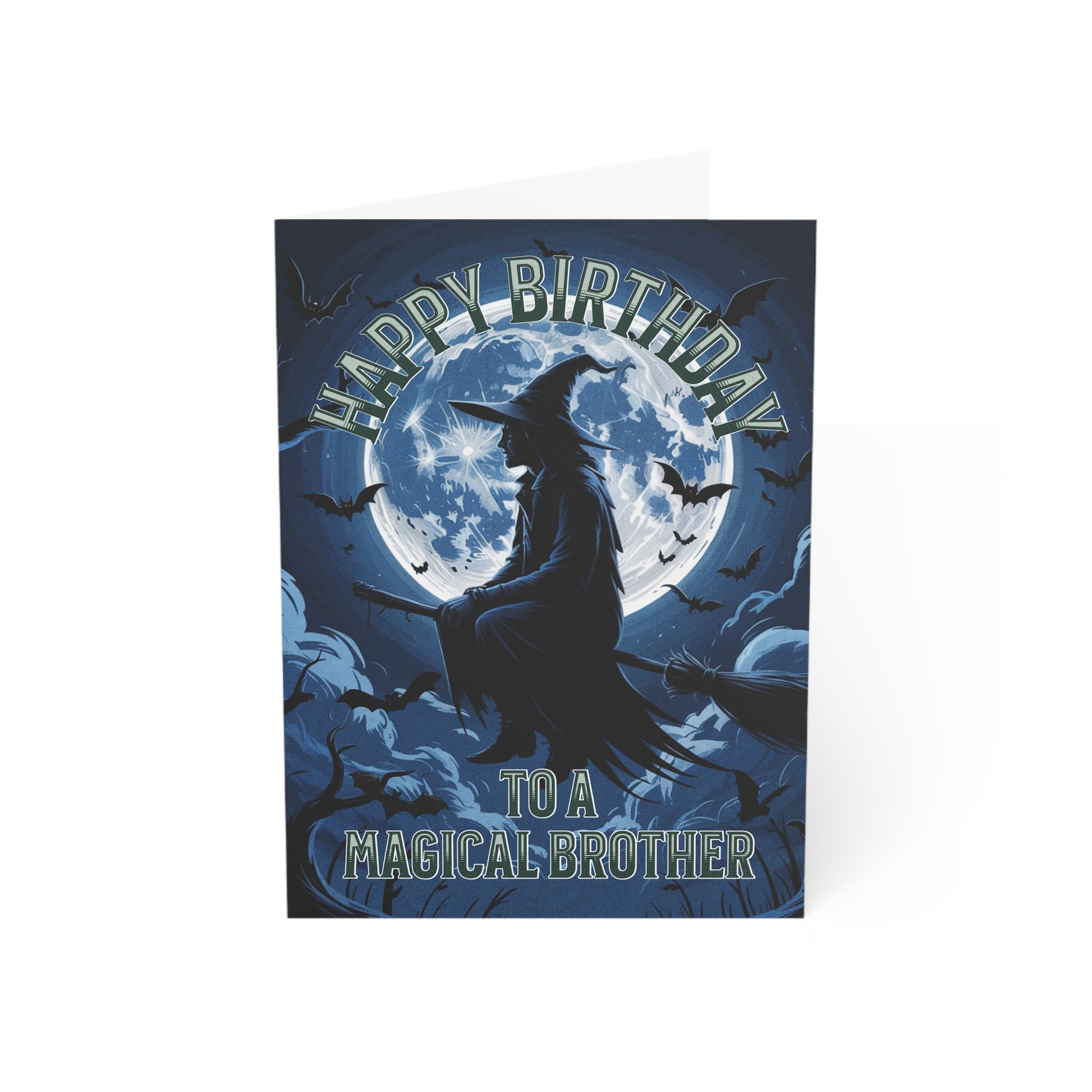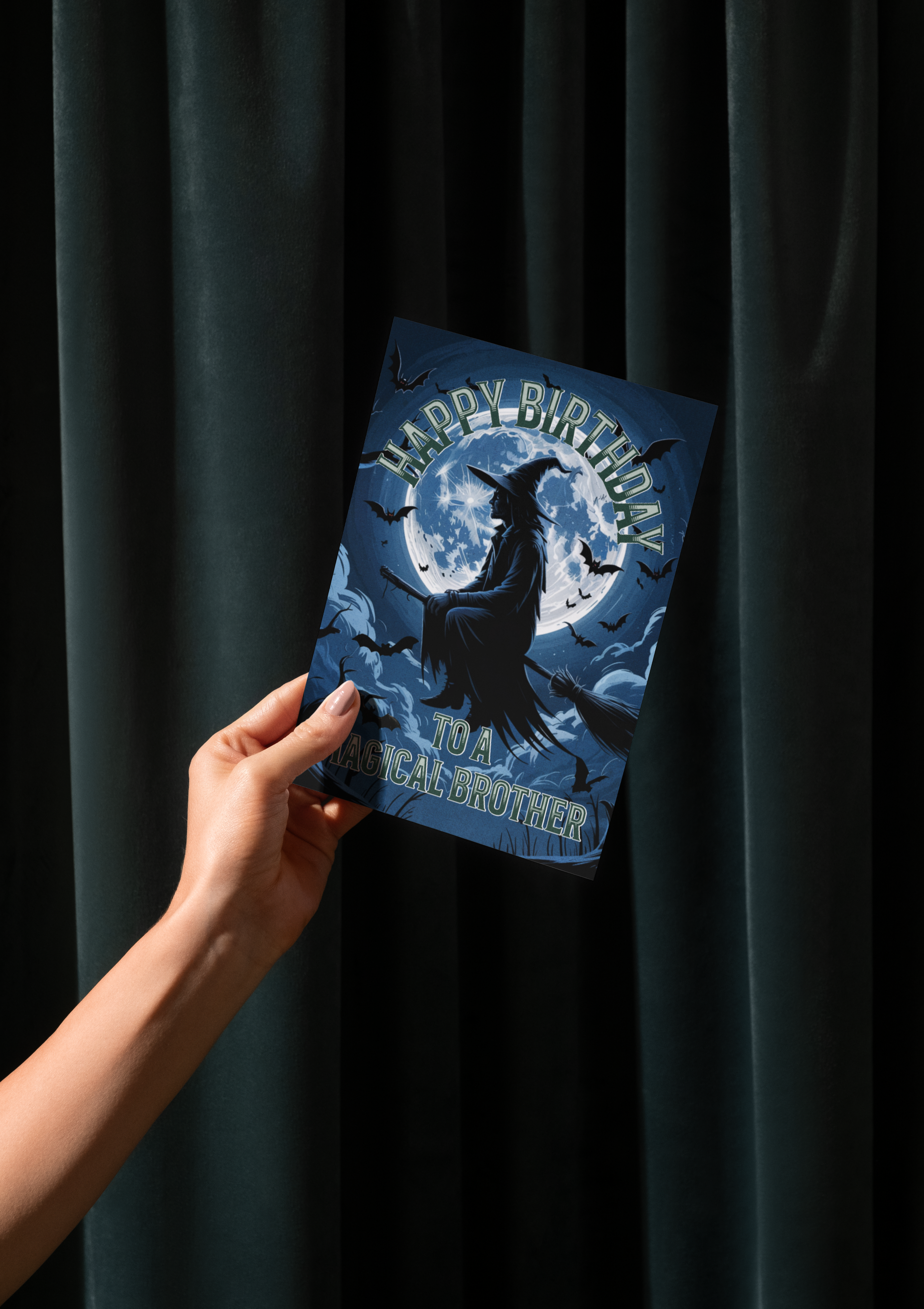 Celebrate your brother’s birthday with gothic magic and celestial wonder. This enchanting card features a wizard soaring beneath a full moon, his black robes flowing and long hair trailing like stardust, as bats glide across the night sky.