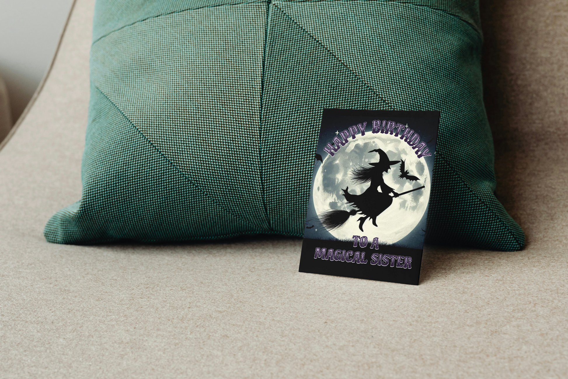 Make your sister’s birthday magical with gothic charm and celestial elegance. This enchanting card features a wizard soaring through a starry night, moonlit and graceful, with bats fluttering around her in a dreamy gothic scene.