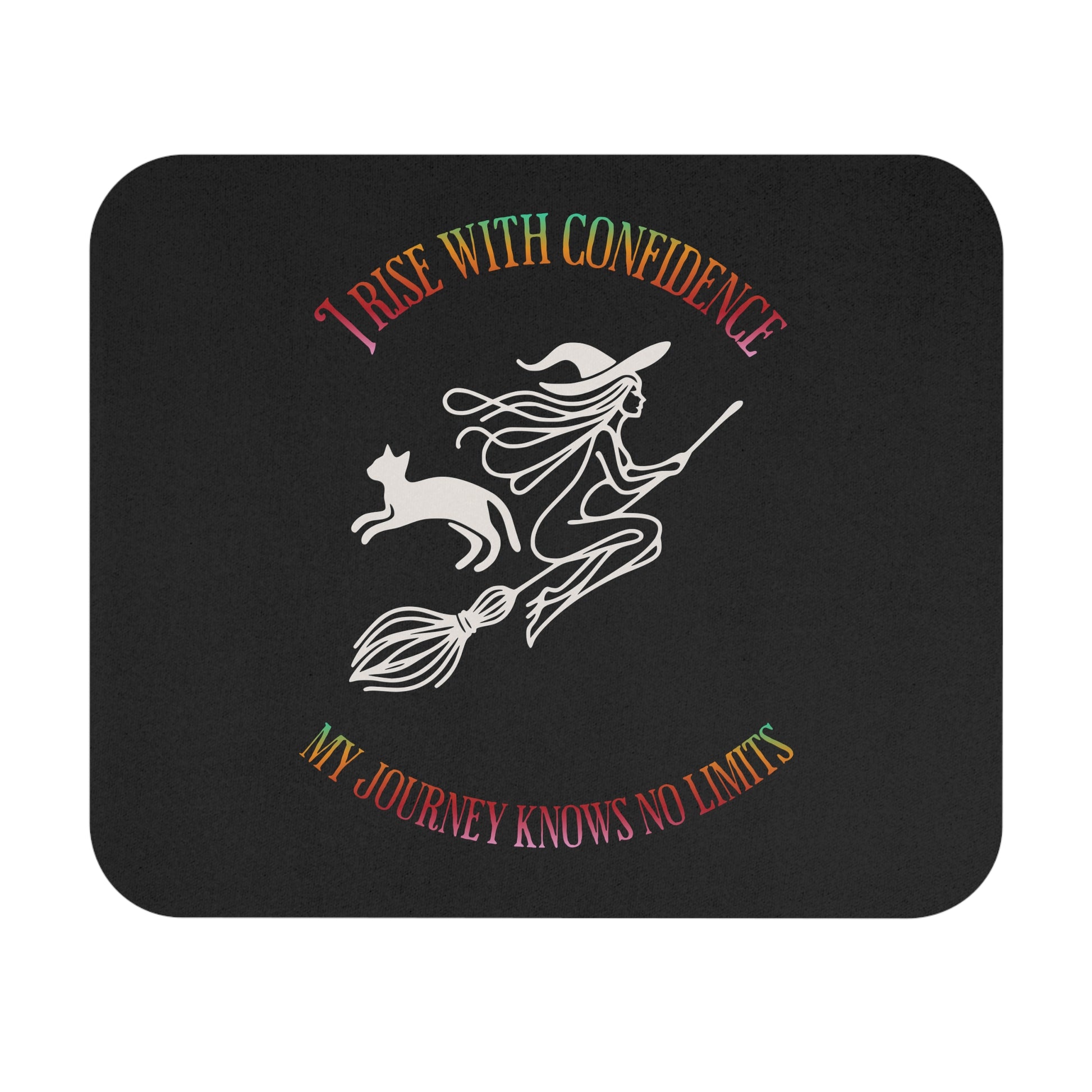 This stunning mouse pad brings a sense of empowerment and mystique to your space. The bold silhouette of a witch riding her broomstick dominates the composition, her feline companion perched beside her, sharing in the adventure. The positive affirmation, "I rise with confidence; my journey knows no limits," is gracefully incorporated into the design. This powerful message is a daily reminder that strength, determination, and belief in oneself can lead to boundless possibilities. Ideal for lovers of witchy décor, this mouse pad is a captivating blend of style and inspiration. It is perfect for lovers of dark art, witchy vibes, or anyone wanting to infuse their space with alluring gothic décor.