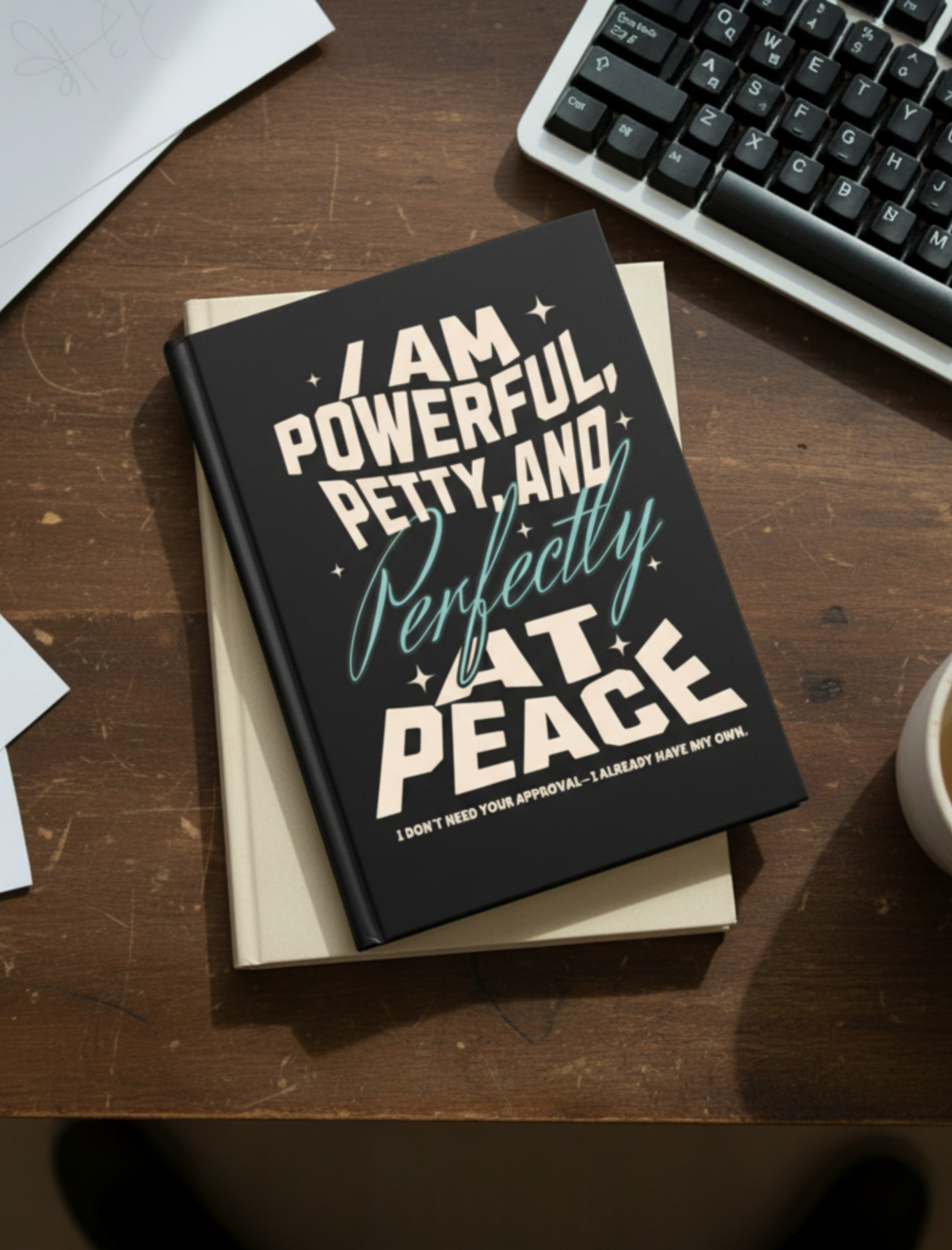 Ideal for any occasion, this hardback journal is both stylish and durable, making it the perfect companion for your thoughts, plans, and dreams. With a sturdy cover and high-quality pages, it’s designed to keep your writing looking fresh and beautiful. The bold statement "I Am Powerful, Petty, and Perfectly at Peace. I Don't Need Your Approval – I Already Have My Own" adds a playful yet empowering touch, making this journal an inspiring space for self-expression. Whether as a gift for a loved one or a treat for yourself, this journal is sure to bring a smile with every page.