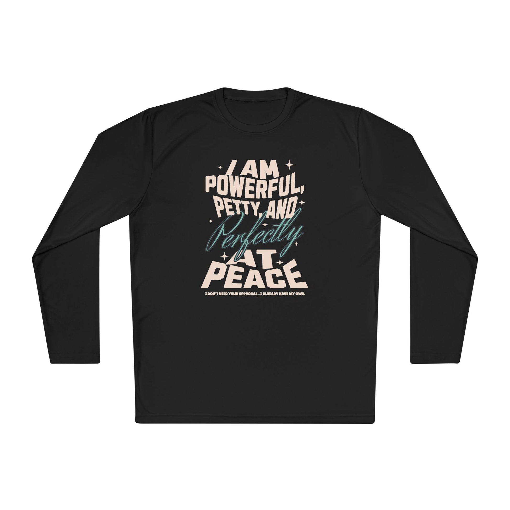 Channel your inner strength with this unisex long-sleeved t-shirt. This captivating design features the bold message "I Am Powerful, Petty, and Perfectly At Peace. I Don't Need Your Approval - I Have My Own" is a striking addition, reminding you every time you wear it that you are perfect just the way you are. Embrace your inner magic and face the world with confidence. Available in various sizes and colors, this long-sleeved shirt will inspire and motivate you whilst being stylish and practical.