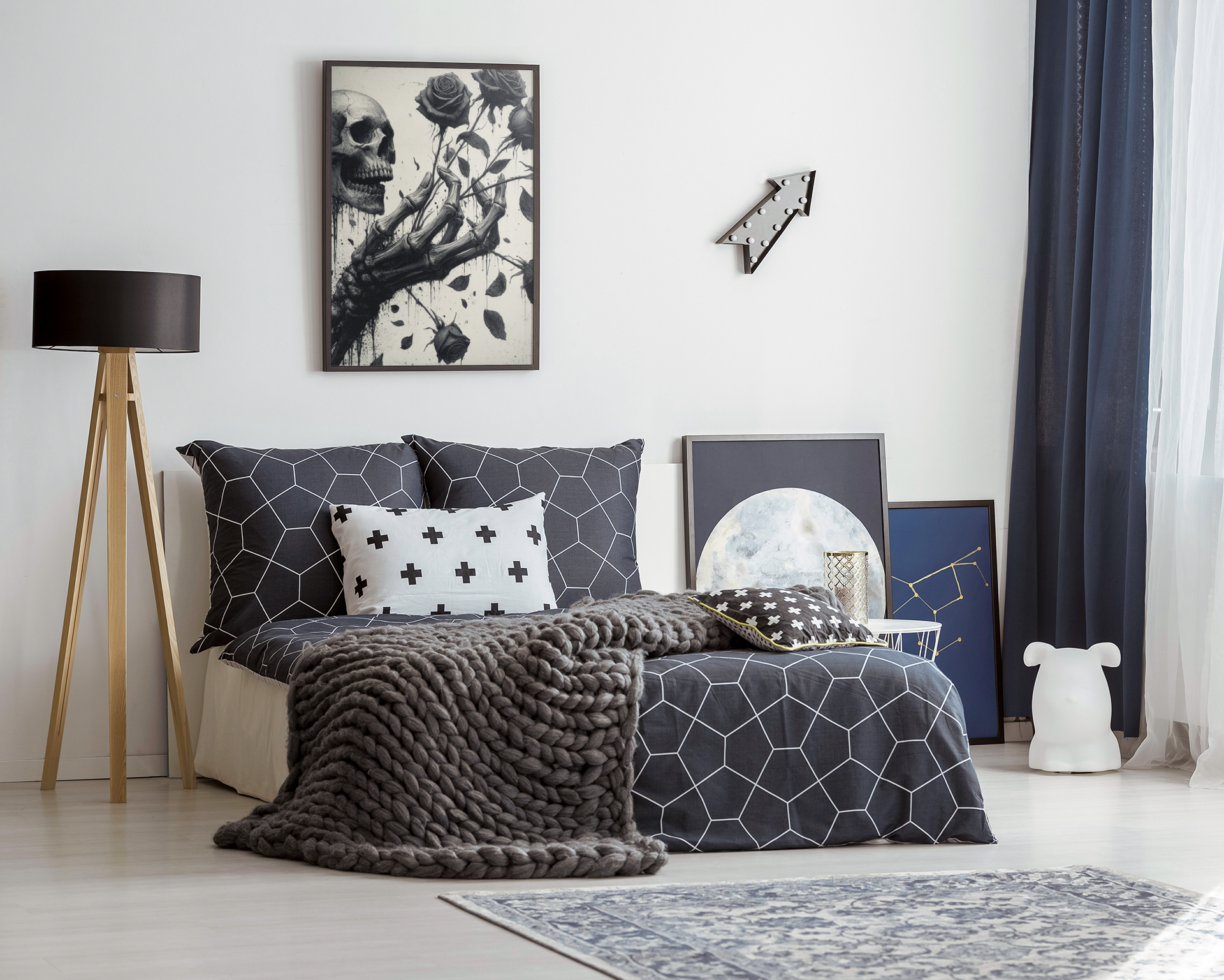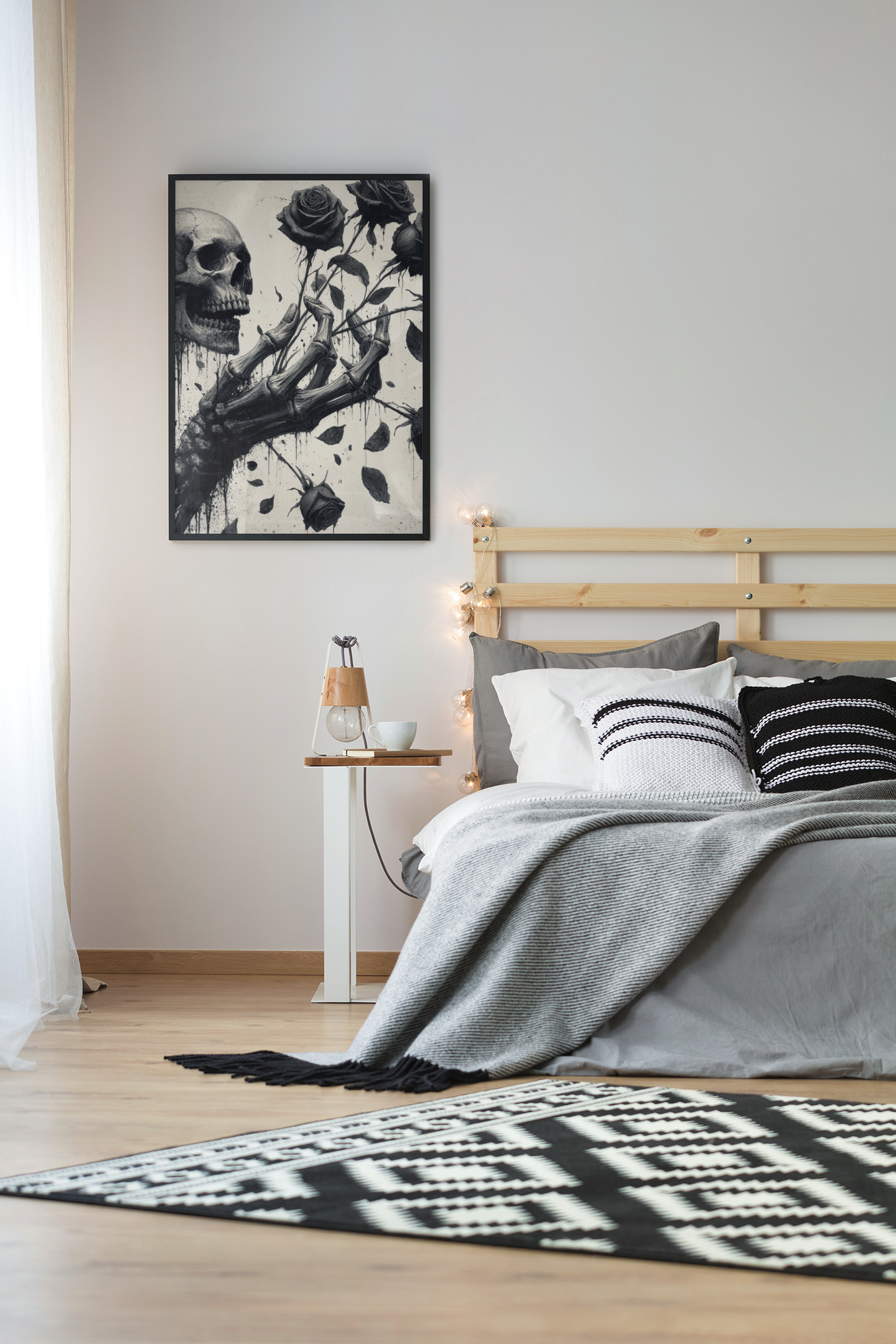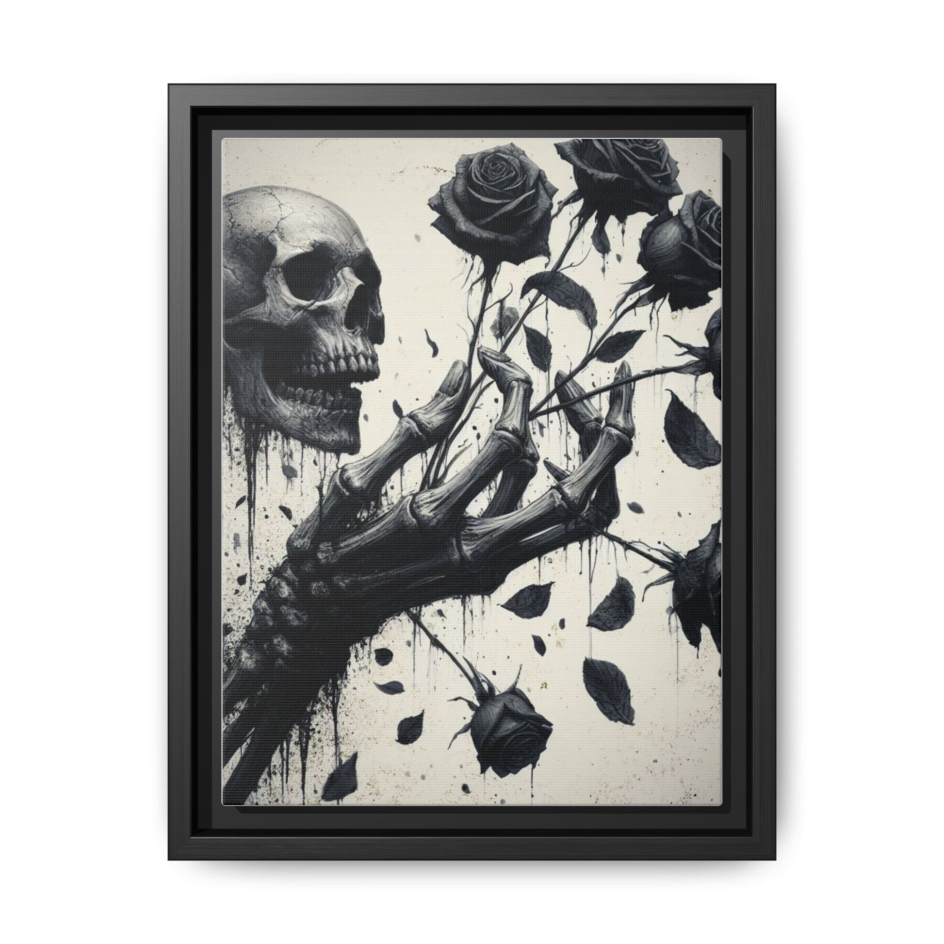 To the left, a grinning skull, locked in hollow defiance, emerges amidst inky drips that spill downward like bleeding shadows, amplifying the contrast between life and decay. Deep, dramatic tones evoke poetic melancholy, making this piece a bold focal point for darkly enchanting interiors.