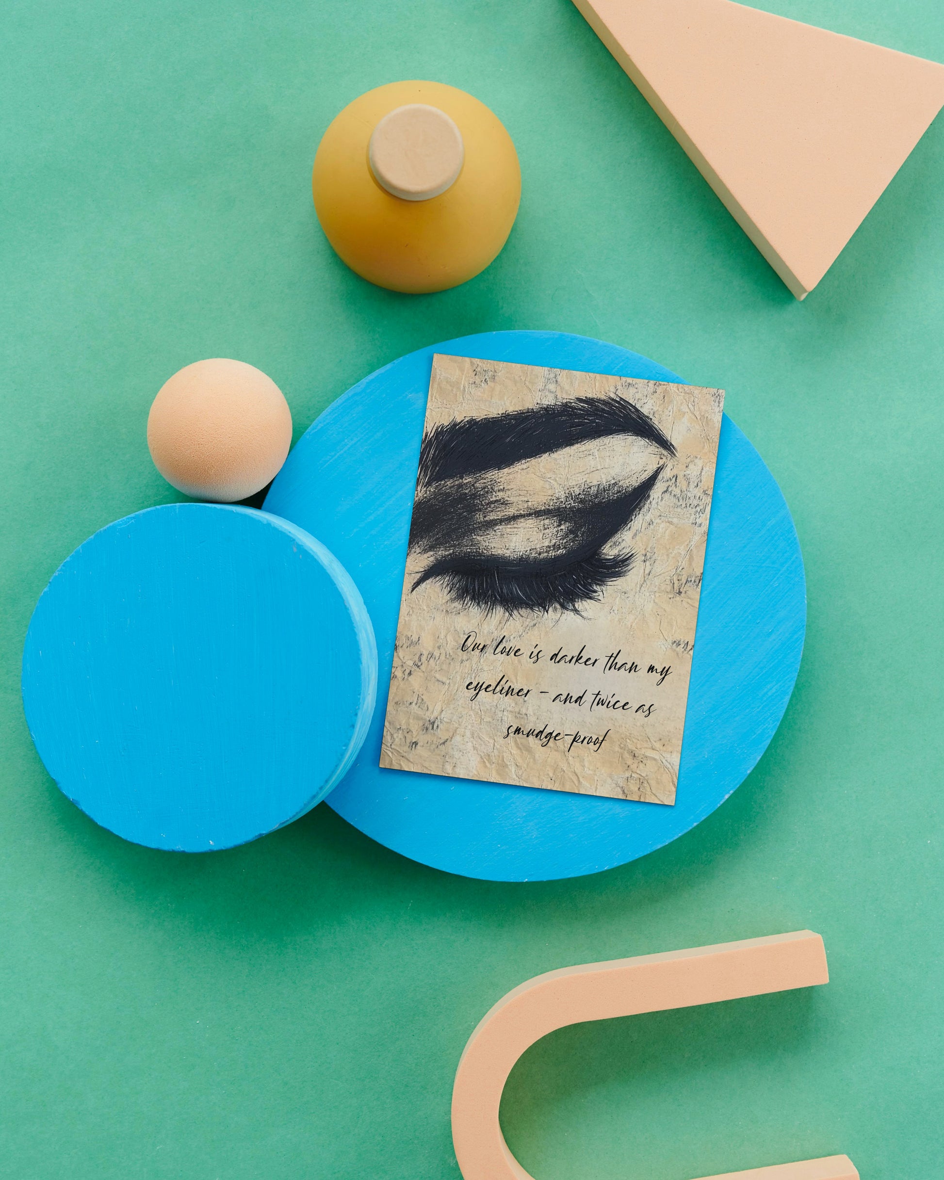 Below, the phrase "Our love is darker than my eyeliner—and twice as smudge-proof" adds dramatic flair with a touch of humor, blending moody sophistication with playful charm.