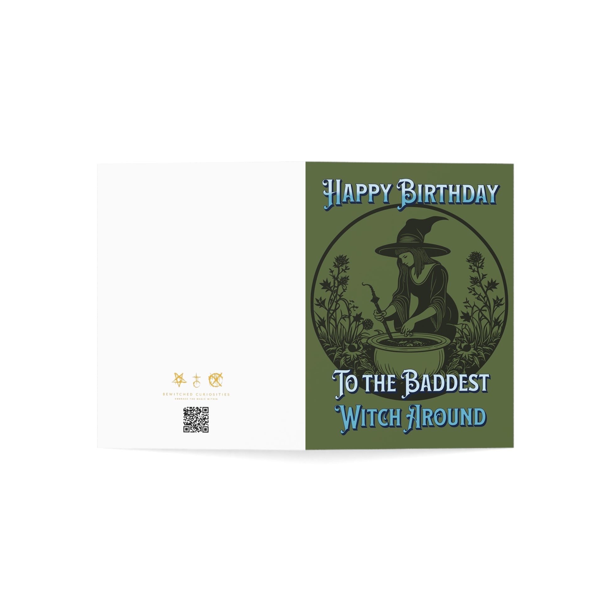 Celebrate the magical soul in your life with this spellbinding gothic birthday card—perfect for the witchy woman who’s always brewing up something extraordinary. Whether she's conjuring culinary delights in the kitchen or nurturing life in her backyard apothecary, this card pays tribute to her power, creativity, and unapologetic flair. The bold message, “Happy Birthday to the Baddest Witch Around,” stands proudly across the front in an enchanting script, offering a cheeky, empowering, fun, and fierce twist.