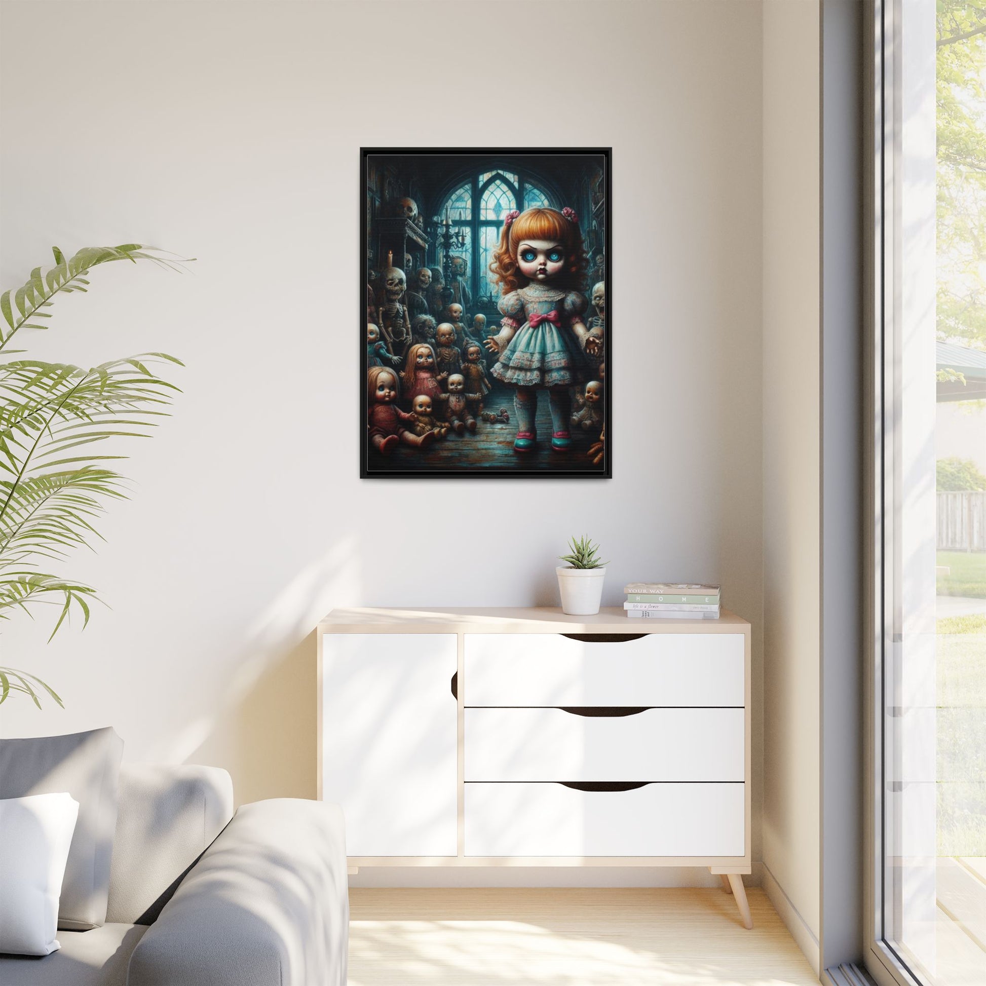 Step into haunting whimsy and eerie elegance with "The Doll’s Dominion", a chilling gothic canvas print where innocence collides with darkness. A creepy doll girl stands proudly, dressed in delicate blue lace and pink ribbons, her ginger pigtails framing a deceptively sweet presence—a gothic queen ruling over lifeless, decaying toys.