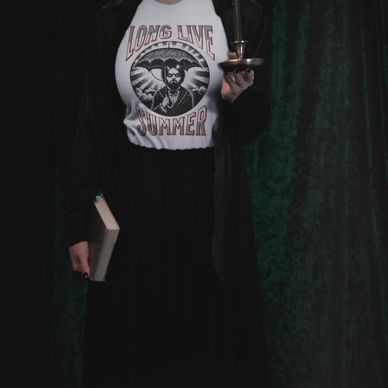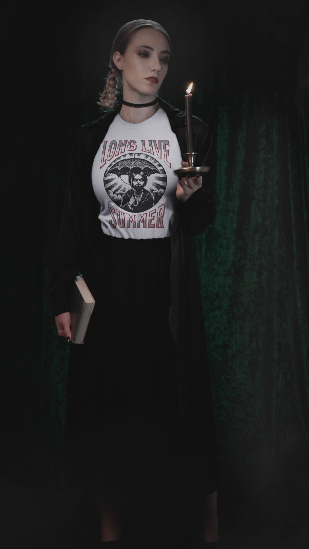 A funny t-shirt featuring a gothic man looking miserable, holding a parasol to hide from the sun, with the text 'long live summer'. Perfect for those who enjoy dark humor and want to make a statement, this t-shirt is ideal for casual wear during the summer months. It appeals to adults who appreciate unique and quirky designs, and is great for summer-themed occasions and events.