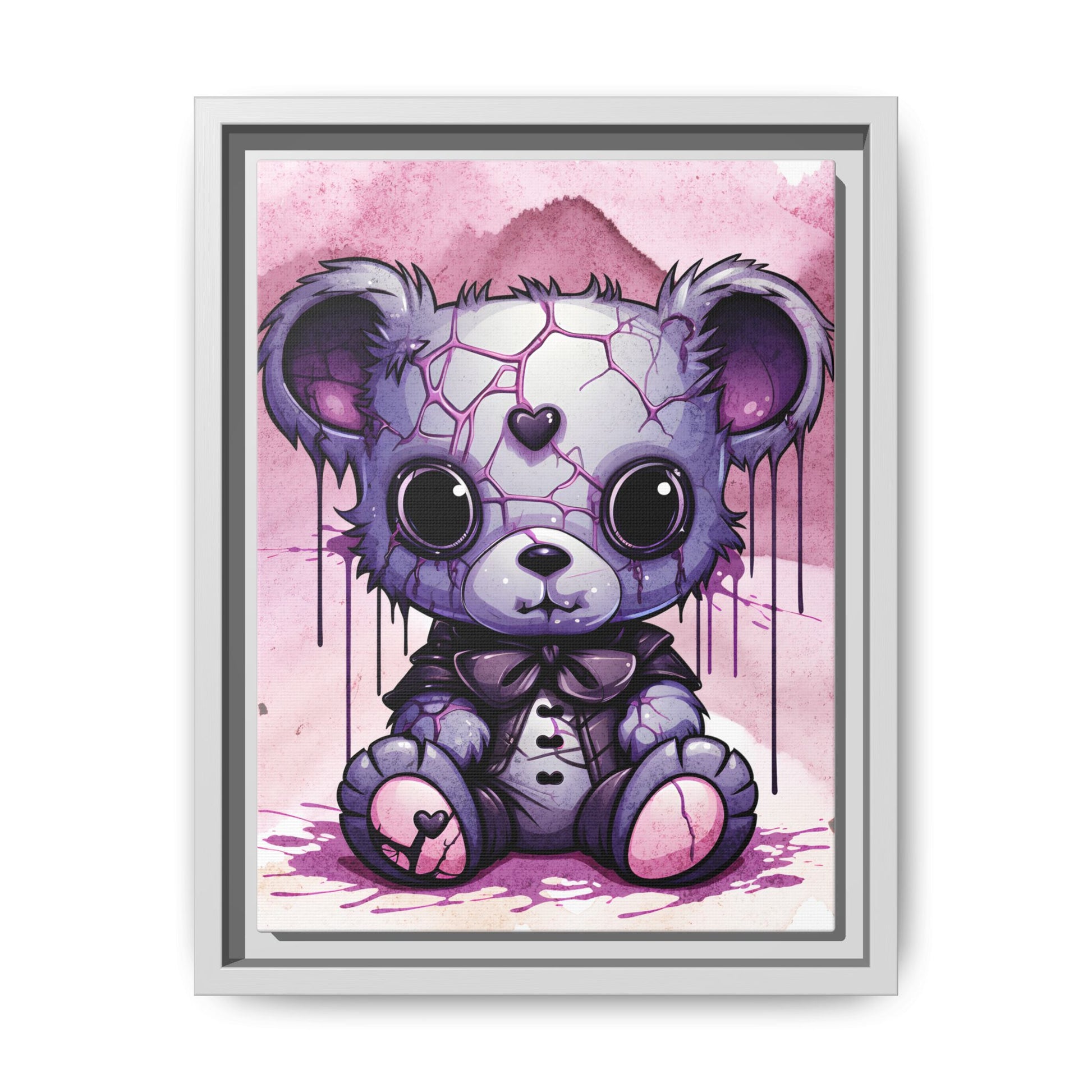 Introduce a striking blend of eerie charm and captivating artistry to your space with this gothic-inspired purple teddy bear canvas wall art. At the heart of the composition sits a unique teddy bear, its textured surface reminiscent of cracked glass or intricate veining, adding depth and intrigue to its design. The bear’s huge, bulging black eyes stare directly at the viewer, conveying a mix of innocence and mischief, while a slight smile adds an enigmatic edge. Rendered in a cartoon style with a grungy texture, this piece exudes both charm and complexity, making it a bold addition to any alternative or gothic décor collection. It is perfect for lovers of dark art, witchy wall art, and anyone wanting to infuse their space with alluring gothic décor or as an alternative art piece for a nursery or child's bedroom.